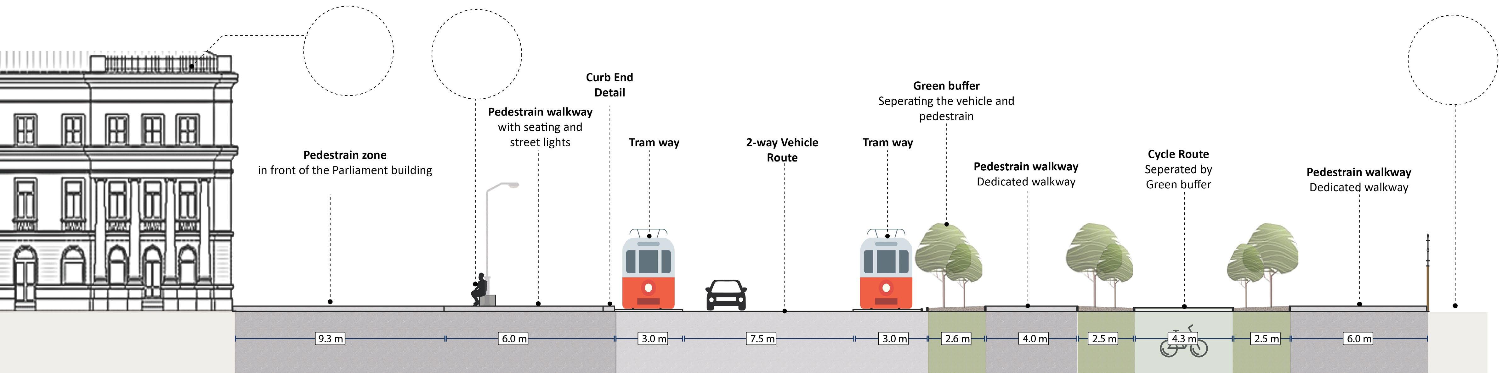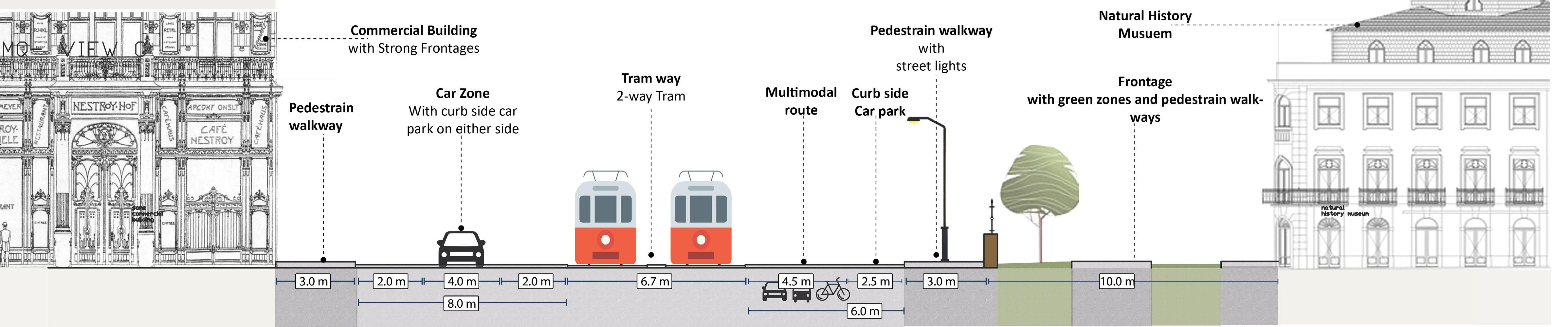• The section of the street at point D runs alongside the Parliament building and the Volksgarten, passing by the Volkstheater tram and train lines. Here, a distinct separation between various modes of transport enhances the pedestrian experience, making it pleasant to walk towards sustainable transportation options.