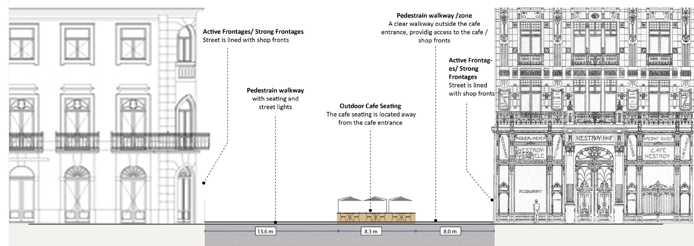 Shaded cafe-front seating area, supporting active street fronts. This element is accommodate keeping in mind movement along immediate shop-front area, alongside considering no compromise in main movement corridor for pedestrian movement Clear sense of direction- created through the balanced enclosed space on the street with the buildings