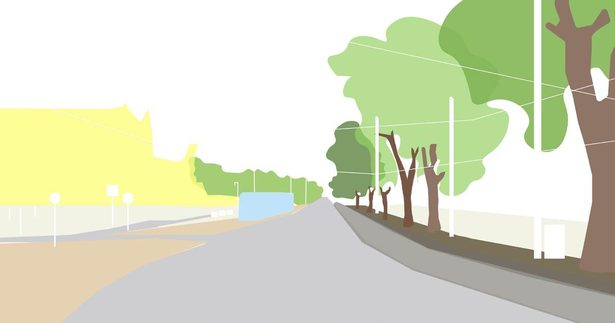 Tram-line movement corridor across vehicular route, along with bus stop and cycle stand on either side of the alley