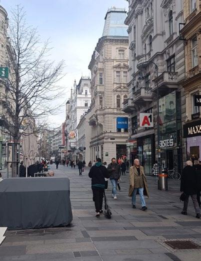 The street section at point B, situated in front of St. Stephan’s Cathedral, showcases a fully pedestrianized square, with space for pedestrian movement and social interaction. Street furniture, lighting fixtures, and signage amenities delineate the square from the pedestrian zone in front of the buildings opposite the Cathedral. The open public space in front of the cathedral forms a captivating enclosure, offering an unobstructed view of the cathedral in all its majestic splendor
