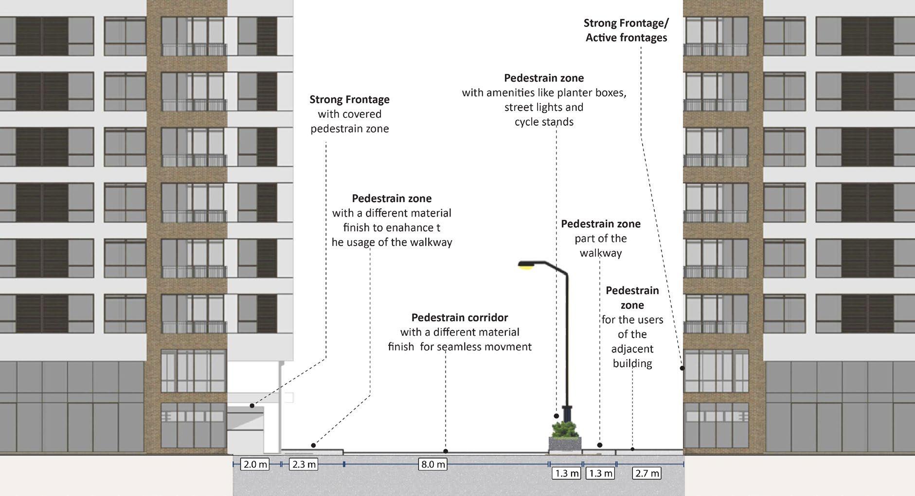 • Through the strategic use of distinct materials on walkways, clear demarcations are established between pedestrian zones and pathways. Abundant lighting and signage facilitate smooth pedestrian movement towards the transport hub. Additionally, a diverse range of green infrastructure serves as a visual barrier to vehicular traffic. The width of pedestrian walkways, complemented by tree-lined paths, creates a comforting enclosure that promotes a sense of safety without inducing claustrophobia.