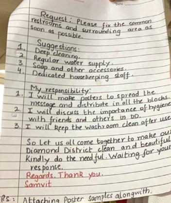 A letter to the chair person of the community stating problem with washrooms and probable solutions.