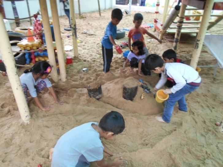 Somechildren startedcollecting the stones from the outdoor and some of them ran tothe sand pitto prepare for the fort there.