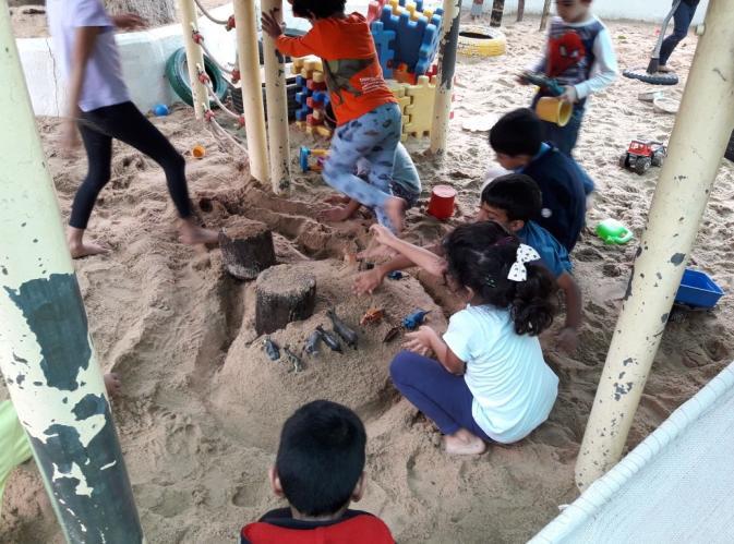 Inthe sandpit, children started working on their fort. While they wereworking, K1,Pre-K and Toddler children were walkingand runningthrough. The fort wasnot comingup.