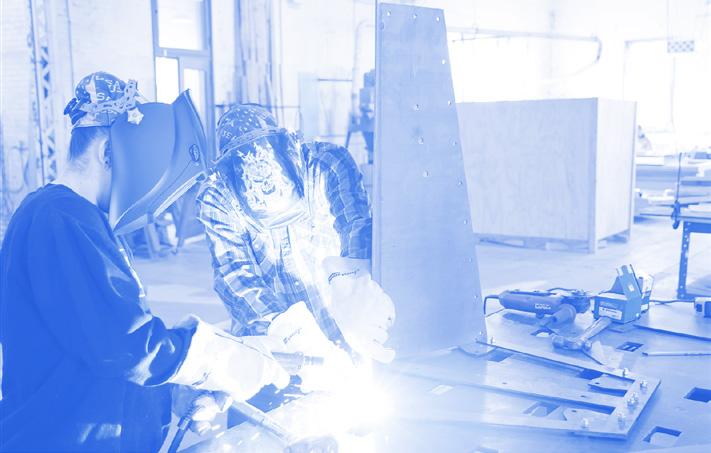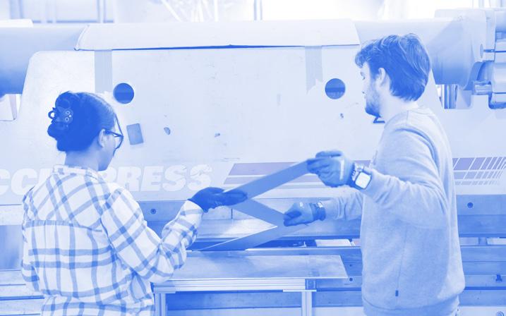 For the steel elements - benches, columns, and roof - fabrication involved a sequence of sanding, press braking components to match shop drawings, and finishing each piece with paint before installation.