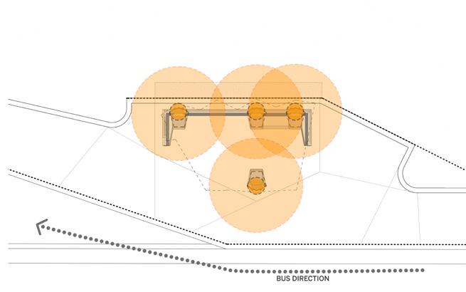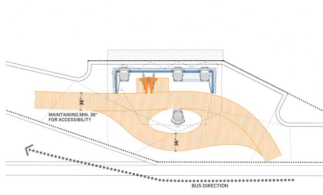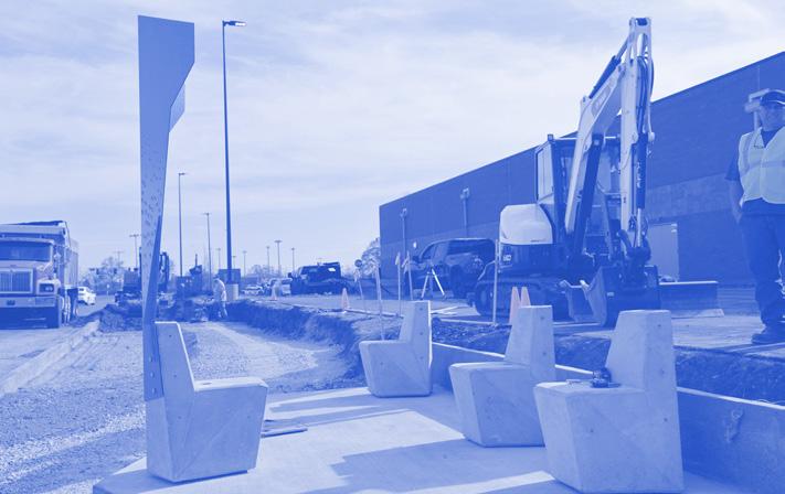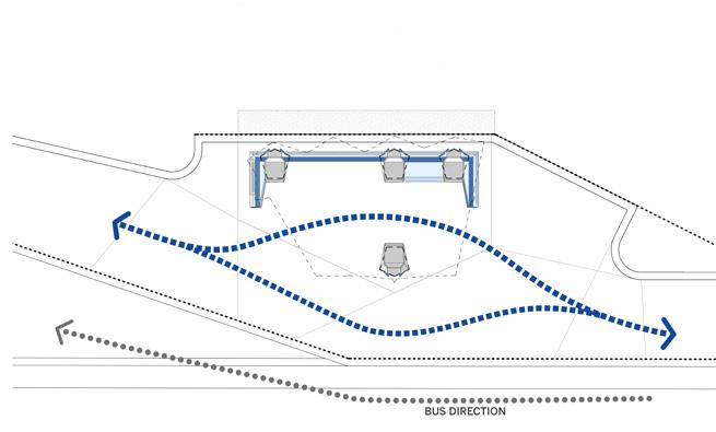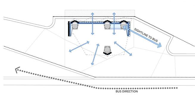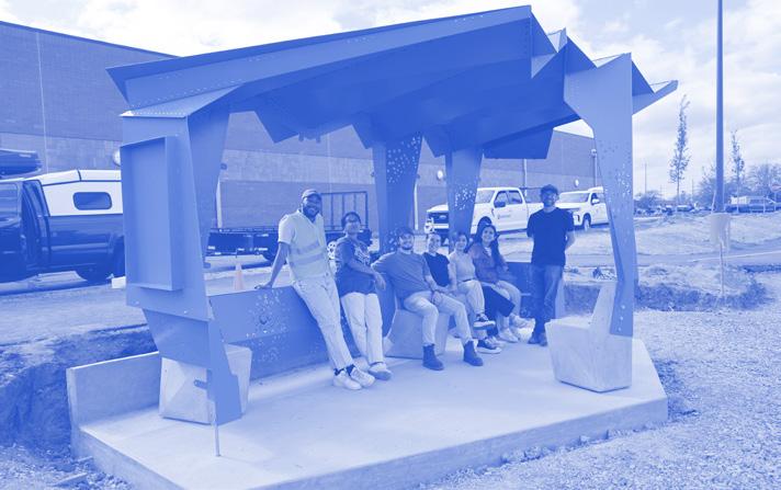 This bus shelter in Columbus, Indiana, folds sleek steel into a welcoming space for gathering. Modular concrete foundations anchor the structure, while connecting steel benches offer places to lean, rest, and gather - with seating designed for all. Two end caps embrace the shelter, providing protection while maintaining openness and visibility. Perforated steel and fritted glass panels echo the flow of Columbus’s river map, quietly rooting the shelter in its landscape and community. This is a space designed not just to serve, but to embrace and unite.