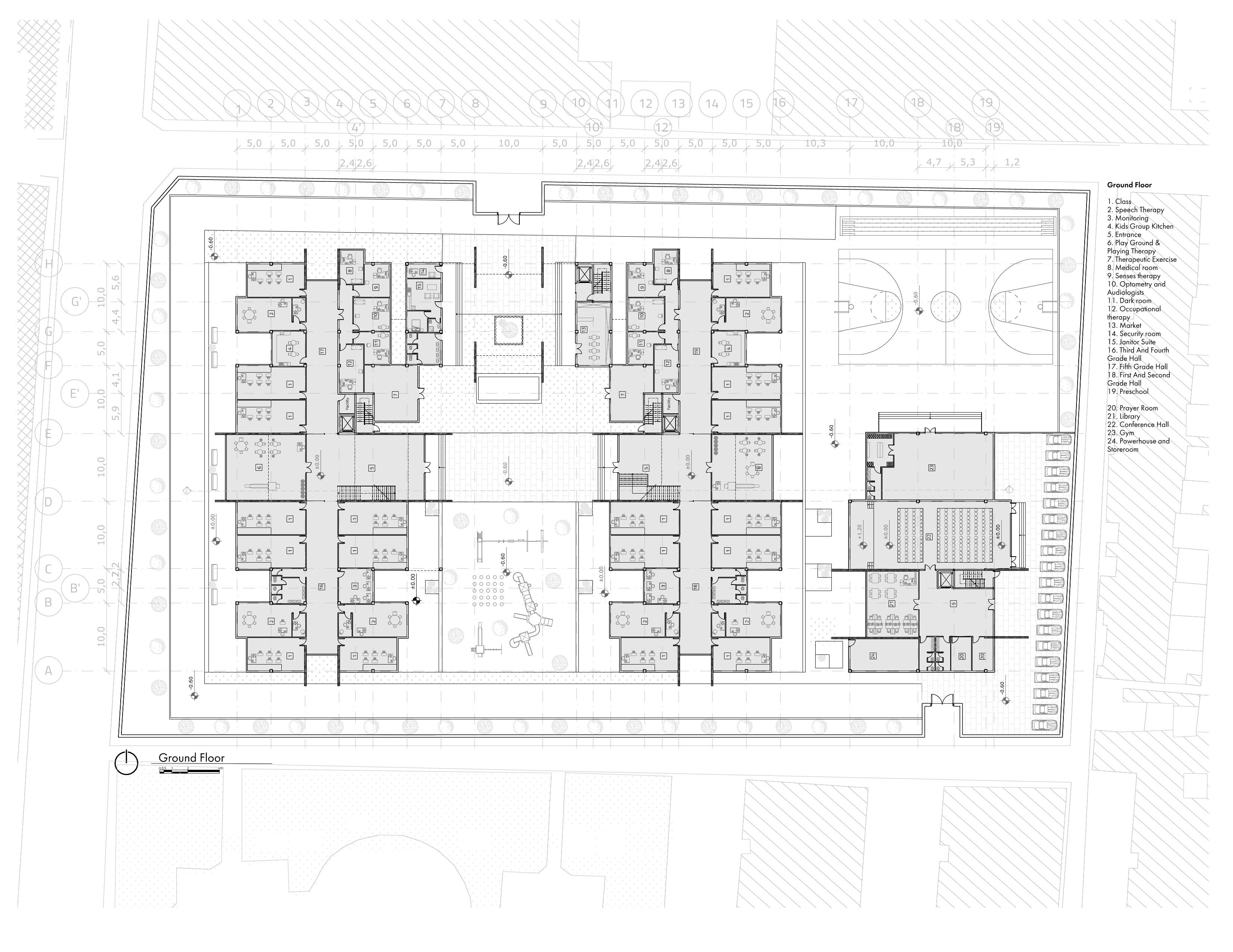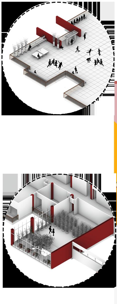 Due to the lack of specialized personnel in the field of treatment and education of autistic children, a portion of the complex was dedicated to specialized training for teachers. The educational section was also divided into two groups to maximize the focus of care and education, creating an environment more suitable for each age group. The well-being of the children remained the main focus throughout the design, with features such as a greenhouse for interaction with nature, seamless indoor–outdoor classroom spaces, abundant natural light, and thoughtfully designed group hubs to foster comfort, engagement, and social connection.