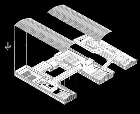 The truss guaranteed the large span, and the façade was also attached to the columns with cables to remain stable. There is a small space between columns and old walls and would not transfer any pressure. The former exhausted roof changed with the new curved roof supported by the truss.