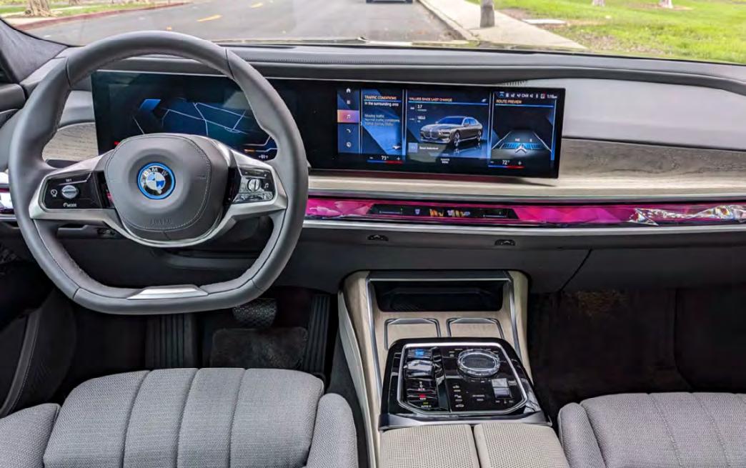 According to BMW, a button-free future awaits us. The interior of their impressive sedan is filled with an abundance of screens. A continuous, curved pane of glass houses both the driver’s display (measuring 12.3 inches) and the infotainment display. Controlling all functions is done seamlessly through BMW’s iDrive system or the voice recognition feature, eliminating the need for physical buttons. This forward-thinking approach showcases BMW’s commitment to a sleek and futuristic interior design, where screens take center stage, providing a sophisticated and intuitive user experience.