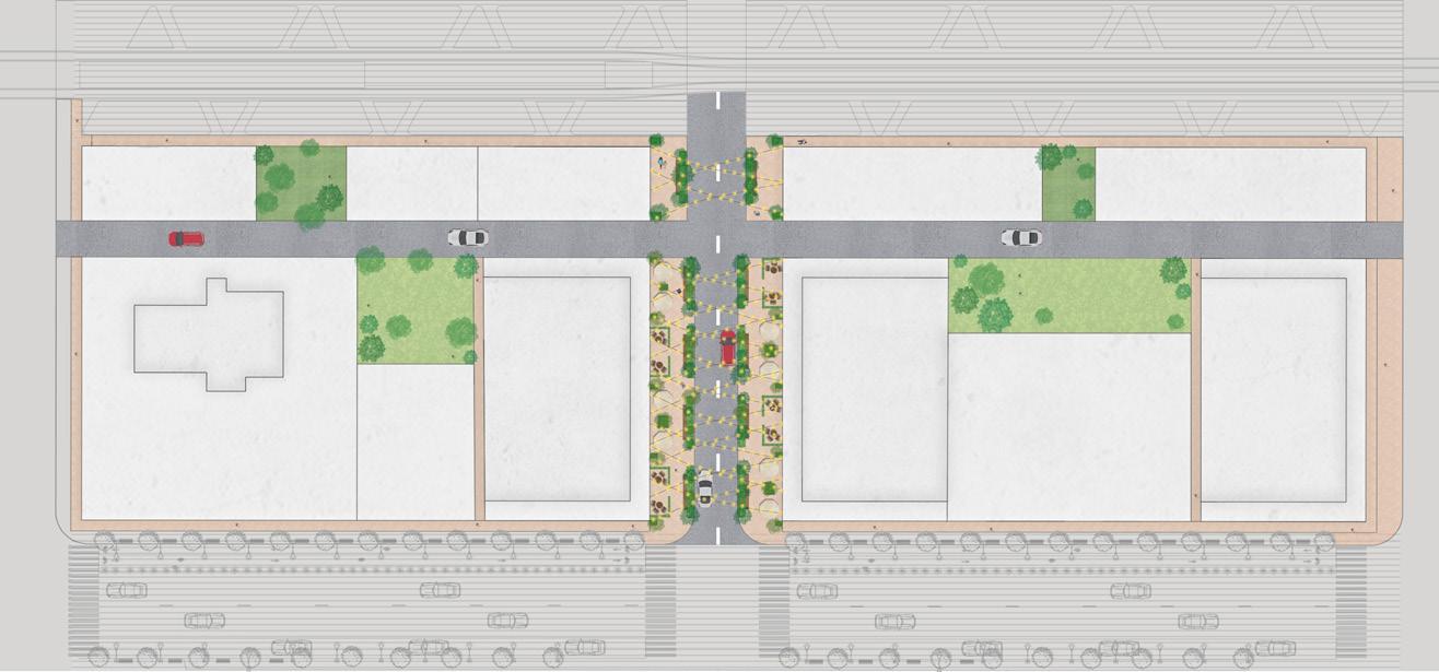 • Tactical: Mass greening of Plaza parking lots introduce permeability and shade to the largest parcels along corridor;