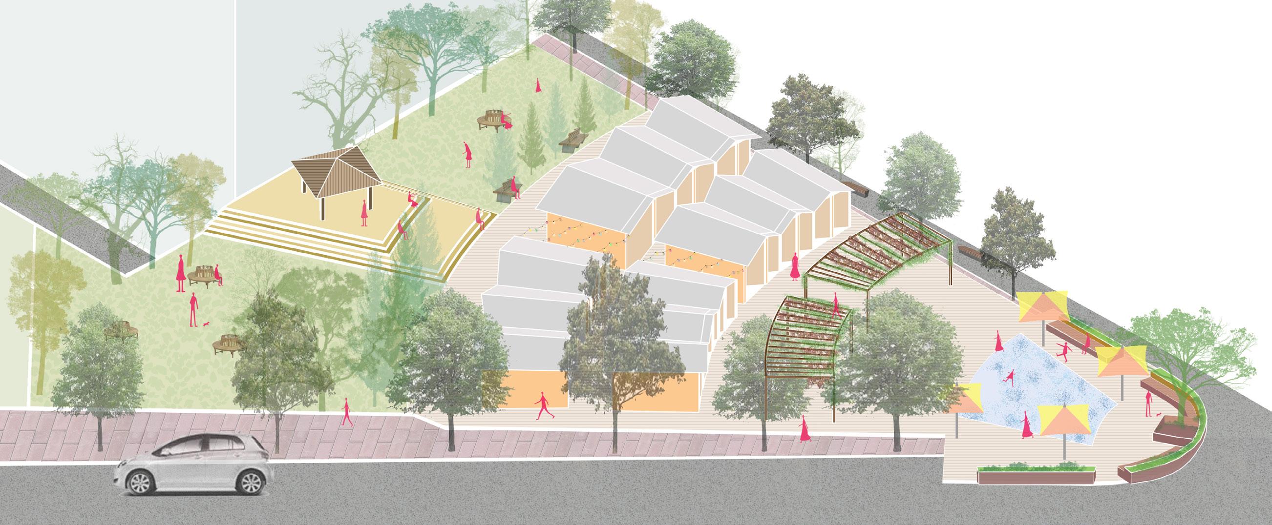 • Modest: Grand pedestrianization scheme of northern Plaza site frames the creation of a new flexible pseudo-public space for pop-up markets and events.