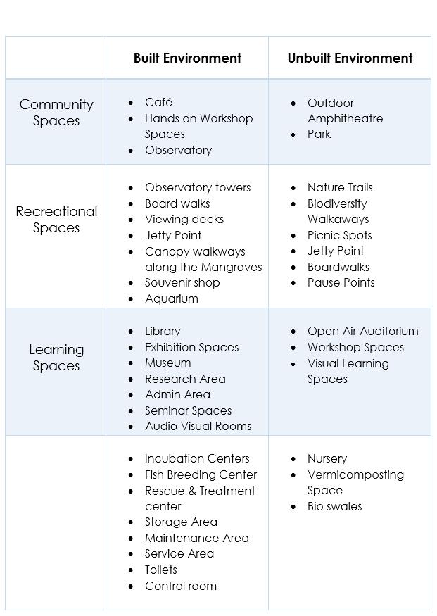 Significance of the mangrove can be explained with the display Areas , Boardwalks within the mangroves and by organizing workshops for Mangrove cleaning etc. Flamingo safari and Observatory towers can act as interactive spaces . Reccreational spots with Education and Entertainment Zones will attract more number of young youth , School Children and Different age group of Visitors . Such centers will help Conserve the Biodiversity ,Consequently the people will be more aware about the biodiversity.