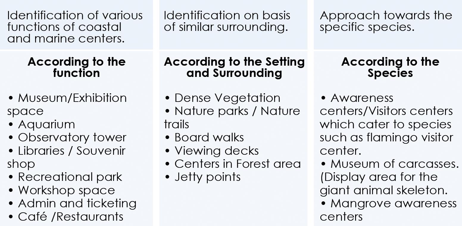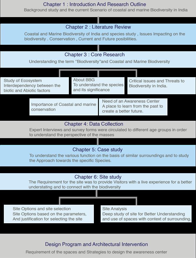 A Few parameters of primary and secondary research are broadened in the following chapters. The first chapter starts with the introduction, background study, and the literature review, of the topic. Followed by understanding the coastal and marine biodiversity and its significance, Causes, critical issues and the current scenario of marine Biodiversity. The Second chapter is the data collection, in which Expert Interviews and survey forms were circulated to different age groups in order to understand the perspective of the masses towards coastal and marine biodiversity, three of descriptive interview surveys are added to this chapter. Which helped me gather future inferences. National, International and live Case studies were done for understanding the functionality of the awareness centers. The design program is thus a result of the research carried out in an extensive manner.