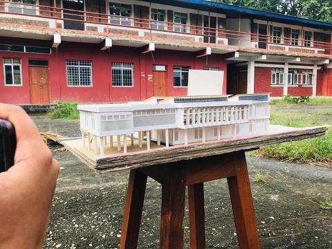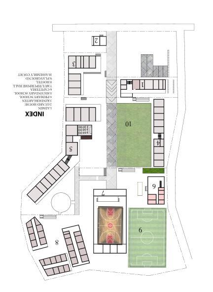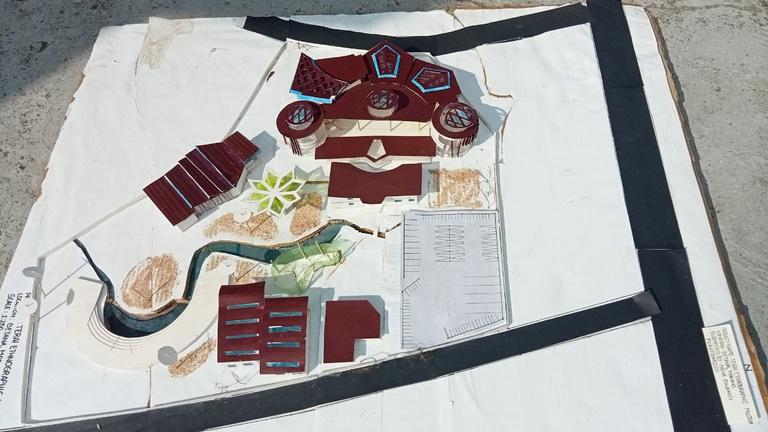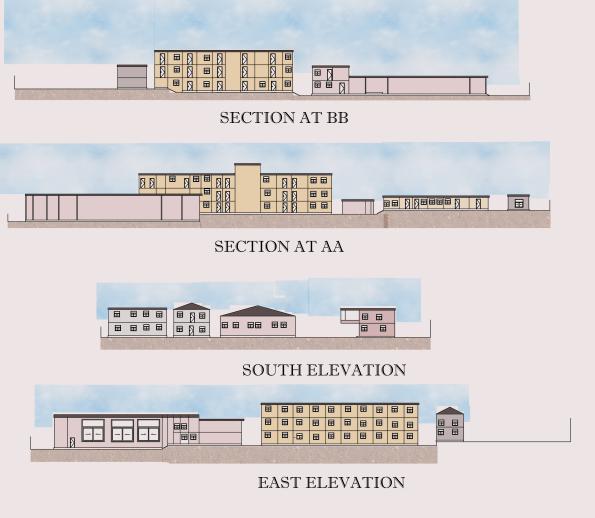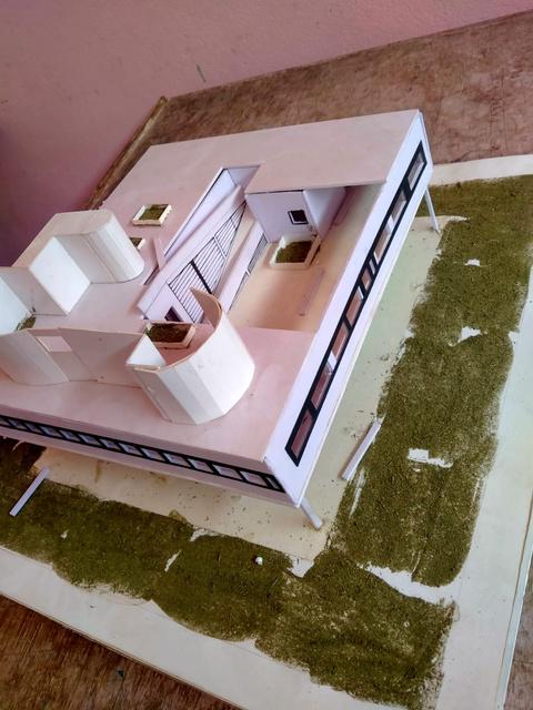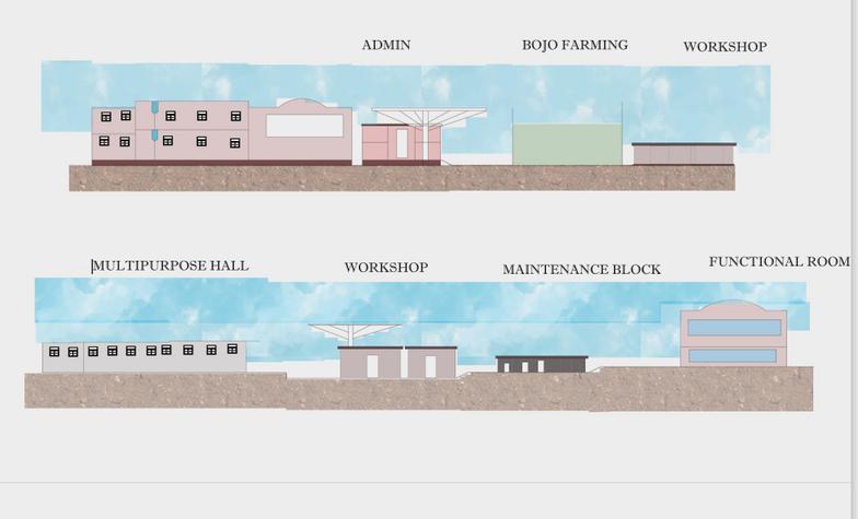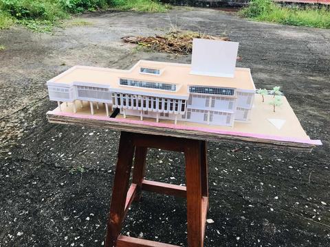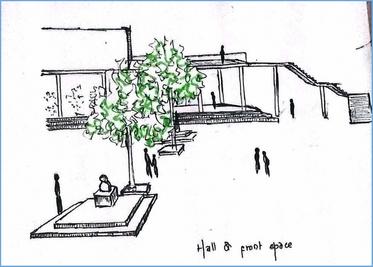 Community hall with library at the upper level library assessible via external stairs which is passes throufh the lower level