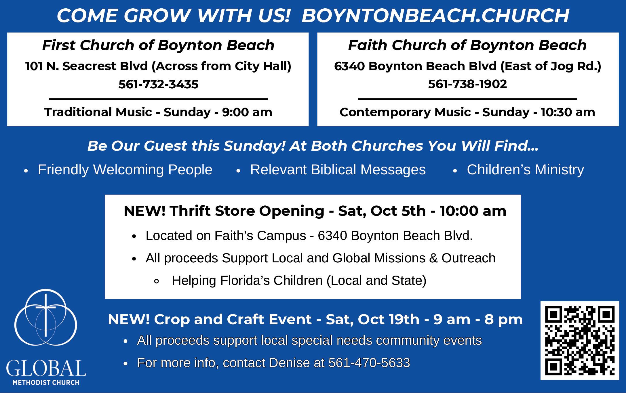 • THRIFT STORE GRAND OPENING – Blessings and Bargains – Grand opening Saturday, Oct. 5th at 10:00am. Located at Faith Church, 6340 Boynton Beach Blvd (just east of Jog Rd.) Proceeds support FL missions, such as beds for underprivileged PB County children. Help make sure no child in our area has to sleep on the floor! Visit www. blessingsandbargains.org