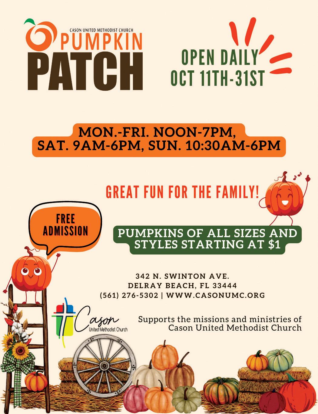 • PUMPKIN PATCH- 29th annual Pumpkin Patch at Cason United Methodist Church, open daily October 11-31st. Free admission to the patch, pumpkins start at $1 and range from tiny to huge! Open Mon- Fri Noon-7pm, Sat 10:00am6:00pm, Sun 10:30am-6:00pm. Free Family Event Sat 10/19 from 10am-1pm and Trunk or Treating Sun 10/27 from 4-6pm. Located at 342 N. Swinton Ave in Delray. Visit www. casonumc.org or call 561-276-5302.