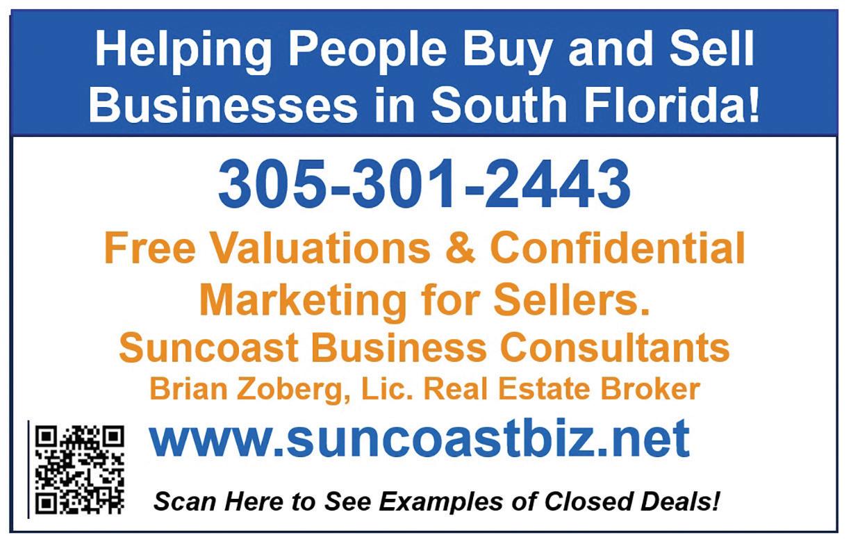 SUNCOAST BUSINESS CONSULTANTS: Helping people buy and sell businesses in South Florida. Free valuations and confidential marketing for sellers. Please call Brian Zoberg, Lic. Real Estate Broker at 305-301-2443.
