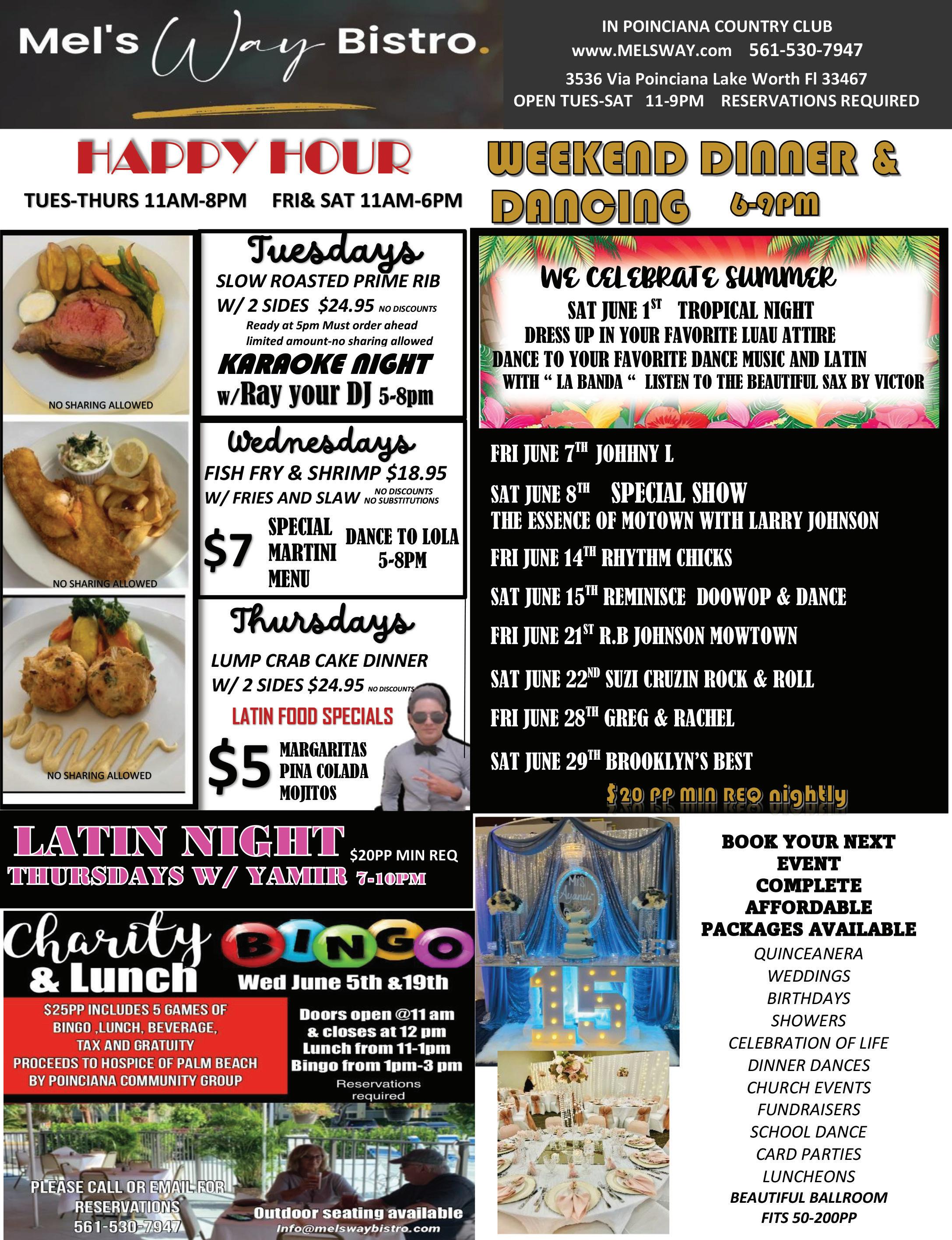•CHARITY BINGO & LUNCH: Join us Wednesdays, June 5th & 19th at Mel’s Way Bistro in Poinciana County Club. 3536 Via Poinciana. Doors open at 11am and close at 12pm. Lunch from 11am – 1 pm & Bingo from 1-3 pm. $25pp includes 5 games of bingo, lunch, beverage, tax/gratuity. Proceeds go to Hospice of the Palm Beaches by Poinciana Community Group. For reservations, call 561-530-7947 or email: info@melswaybistro.com.