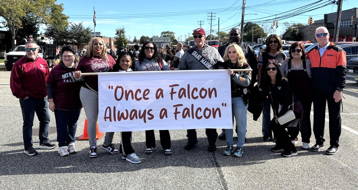 A lifelong resident who graduated from Deer Park High School in 1984, Legislator Donnelly is a Falcon through and through: he has raised his family in, and still serves, the Deer Park community not only as a legislator but also as a four-decade Deer Park Fire Department volunteer. For the 2025 Homecoming Parade, he joined enthusiastic students, community members, school district officials and parade Grand Marshal Anthony “Tony” Santoro for the joyous march up Deer Park Avenue to the football field at the High School. This year’s homecoming was October 18 with a theme of “Once a Falcon, Always a Falcon.”