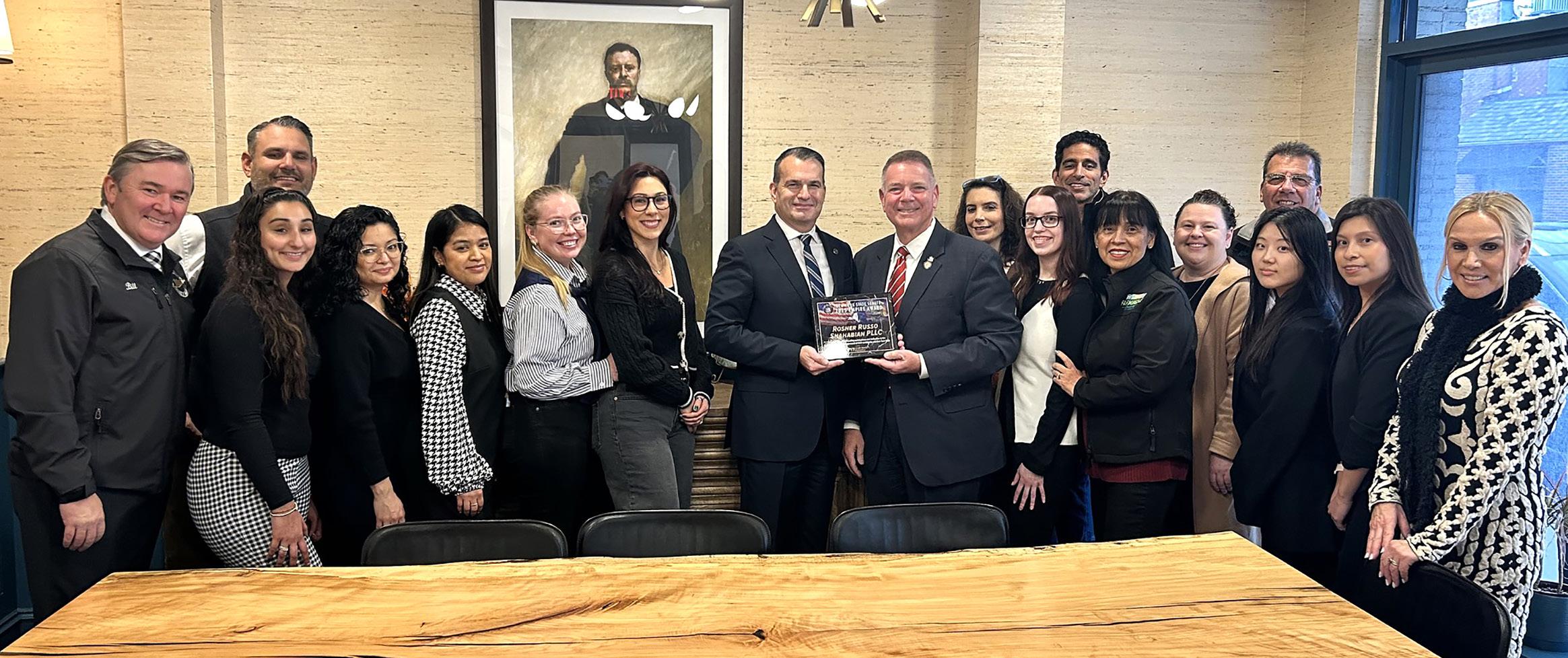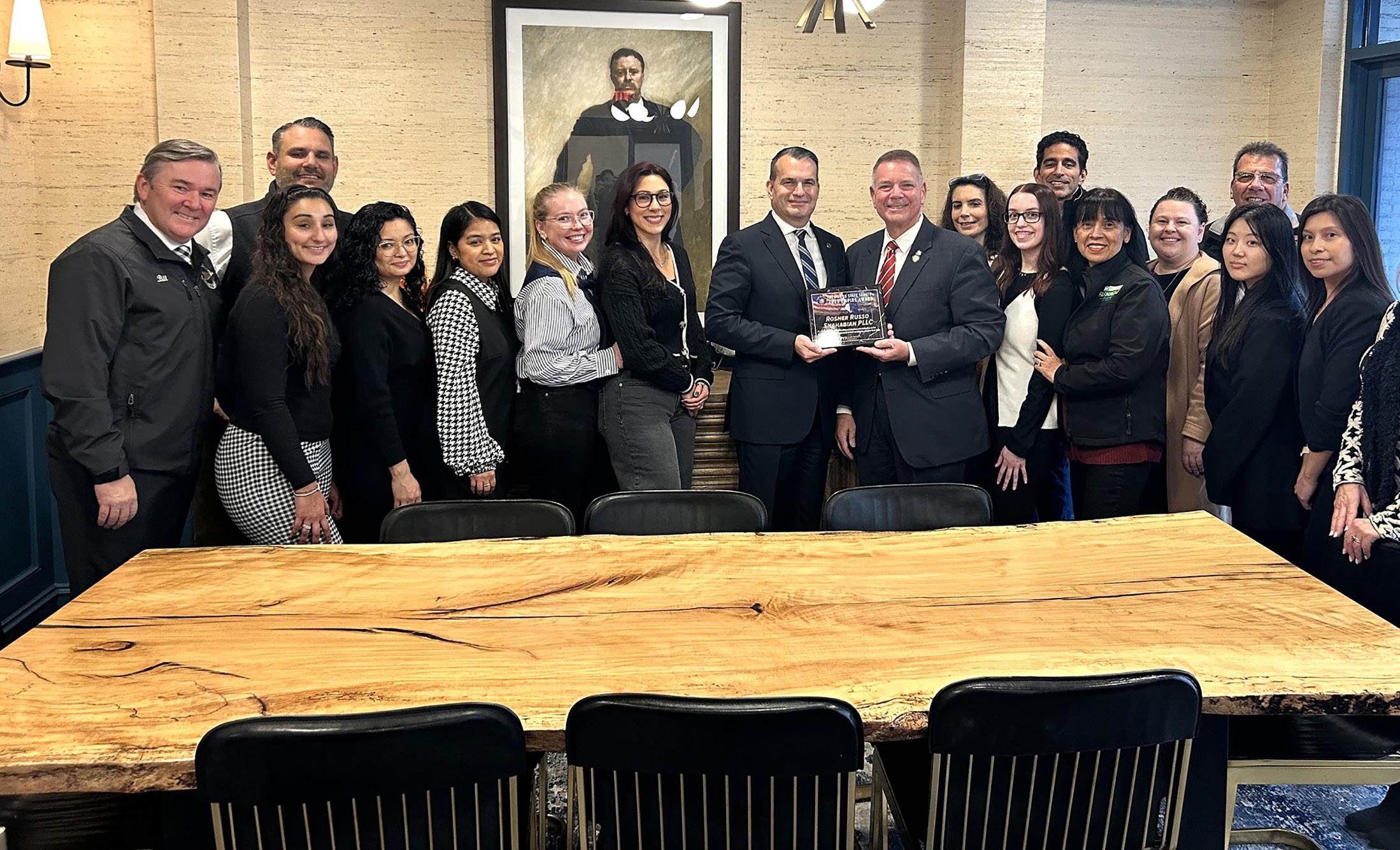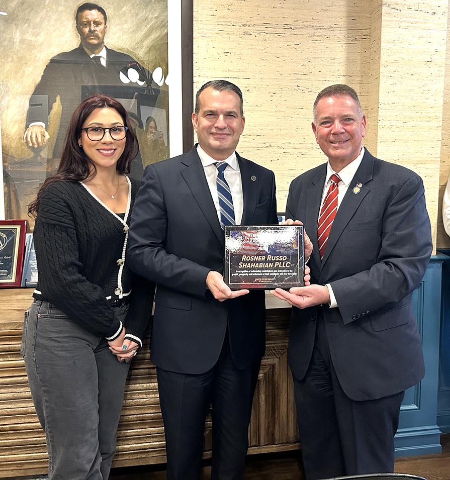 Senator Steve Rhoads presented Rosner Russo Shahabian PLLC with the New York State Empire Award in recognition of the firm’s exceptional dedication to the Farmingdale community. A committed member of the Farmingdale Chamber of Commerce, the firm consistently supports local initiatives through financial sponsorships for the Farmingdale Fire Department, donations that provide back-to-school essentials for elementary students, and contributions to programs that benefit families in need. Rosner Russo Shahabian also
