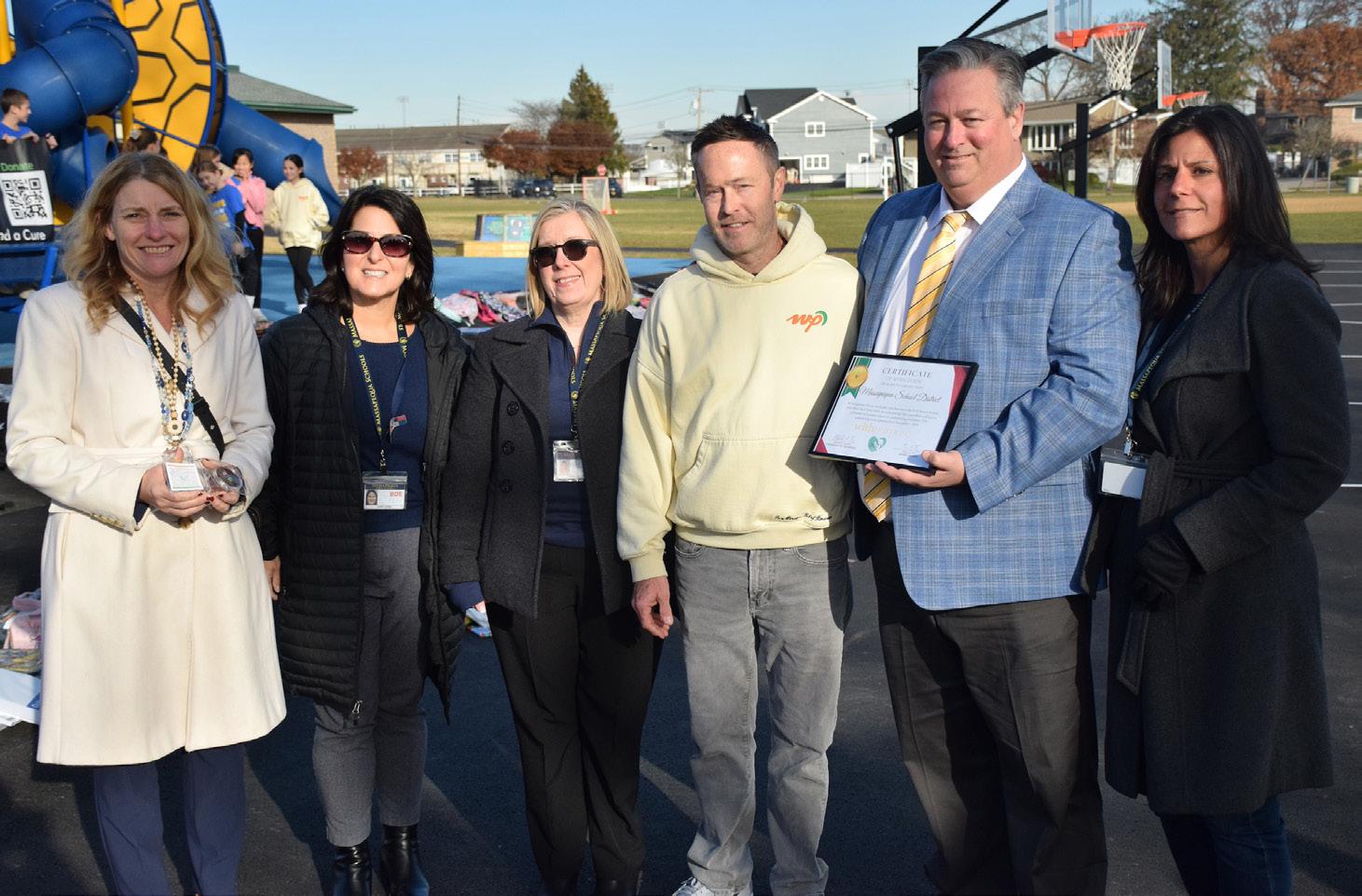 The district was recognized for its support of the backpack drive during a presentation at Birch Lane Elementary School on Nov. 20. From left are Assistant Superintendent for Instructional Services Dr. Michelle Walsh, Board of Education Secretary Cher Lepre and President Kerry Wachter, With Purpose Foundation founder Michael Fay, Superintendent Dr. William Brennan and Board of Education Trustee Danielle Ocuto.