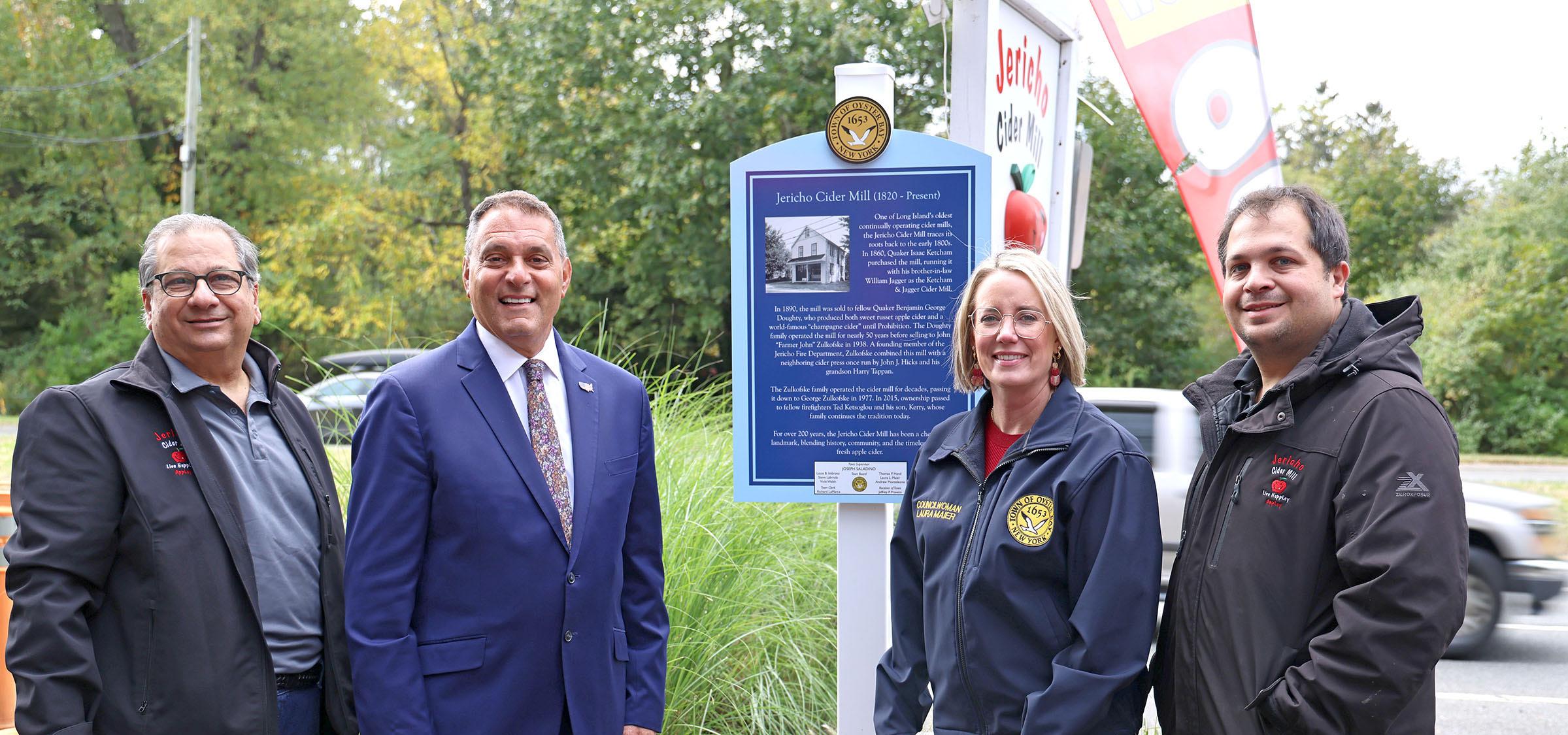 Oyster Bay Town Supervisor Joseph Saladino and Councilwoman Laura Maier gathered at the Jericho Cider Mill, one of Long Island’s oldest continually operating cider mills, to unveil a historical marker marking its more than 200 years in the community. With roots dating back to the 1800s, the Jericho Cider Mill has kept up with the traditions of recipes being passed on through generations. The dedication was held with Ted Ketsoglou, who together with his son Kerry are owner and operator of the facility, as well as members of the Ketsoglou family.