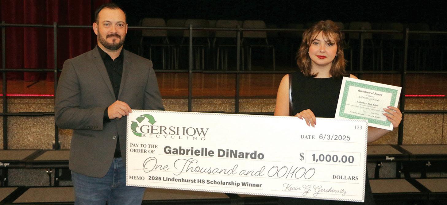 Pictured are Anthony Vanni (left), Manager, Gershow Recycling, and Gabrielle DiNardo (right), a member of Lindenhurst High School’s Class of 2025. Ms. DiNardo was awarded a onetime scholarship in the amount of $1,000 from Gershow Recycling. As a leading environmental recycling company, Gershow awards the competitive scholarship to a graduating high school senior who intends to pursue a degree in either engineering or environmental science.