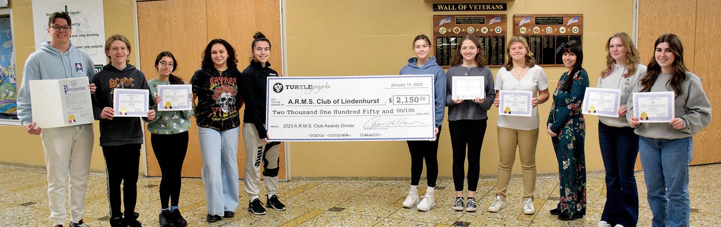 OUTSTANDING COMMUNITY SERVICE EFFORTS - Students from the Lindenhurst High School A.R.M.S. Club recently joined representatives from Legislator Kevin McCaffrey’s office and Village of Lindenhurst Mayor Michael Lavorata to be awarded Certificates of Recognition for their commitment to serving others in the Lindenhurst Union Free School District. Photo courtesy of the Lindenhurst Union Free School District