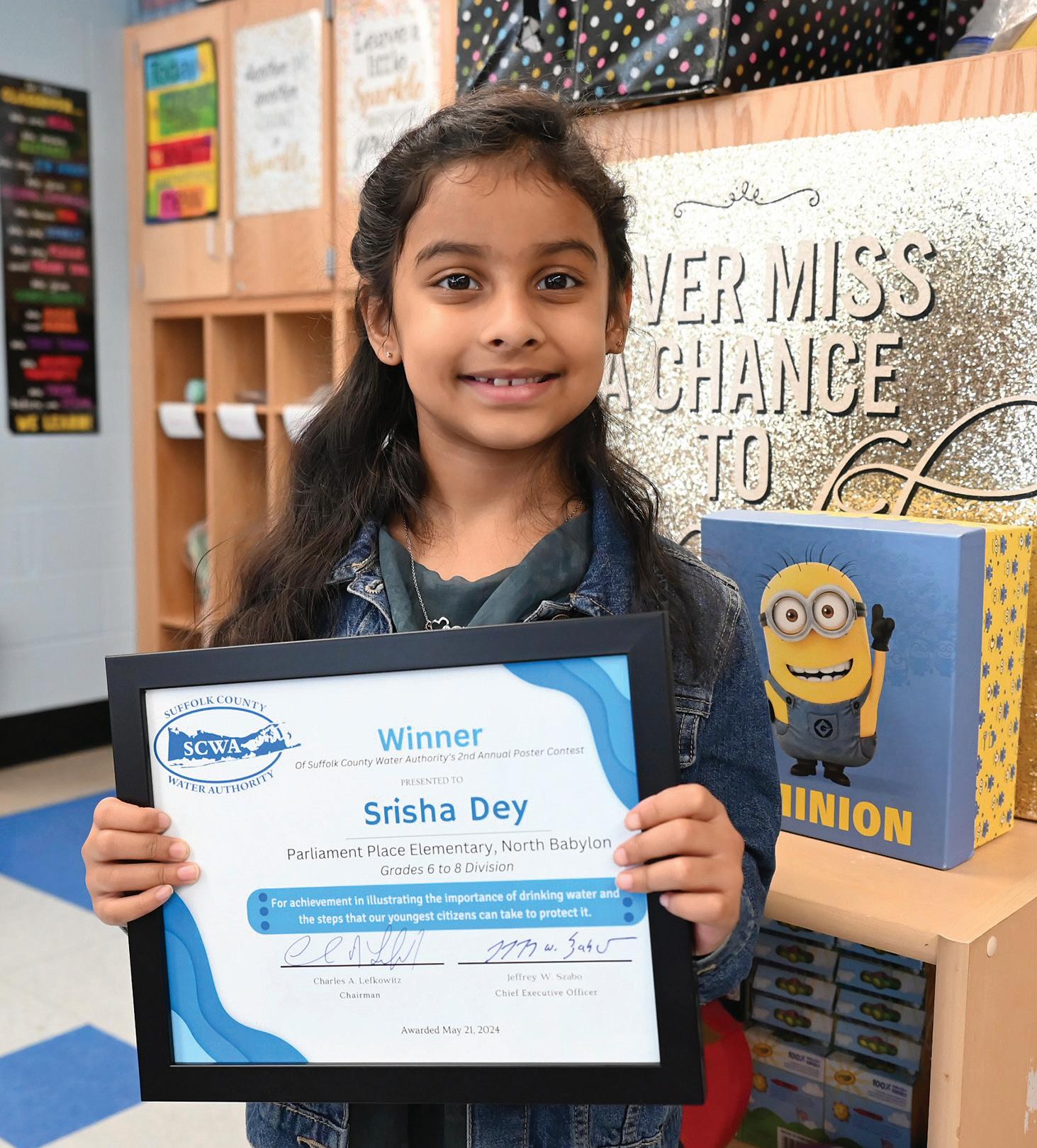 FIRST GRADER AT PARLIAMENT PLACE NAMED POSTER WINNERSrisha Dey, a first grader in Ms. Ivy’s class at Parliament Place Elementary School in the North Babylon School District, was recently named the first-place winner in the kindergarten to second grade division for her artwork in a poster contest sponsored by Suffolk County Water Authority. Her artwork illustrated the importance of drinking water and the steps that younger citizens can take to protect the water. Photo courtesy of North Babylon School District