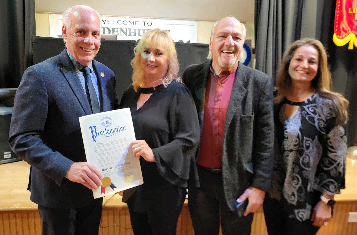 that has been decorating the Moose Lodge for various holidays and events over the past years. Pictured: Presiding Officer Kevin McCaffrey presenting Barbara with a Suffolk County proclamation to honor her outstanding community service.