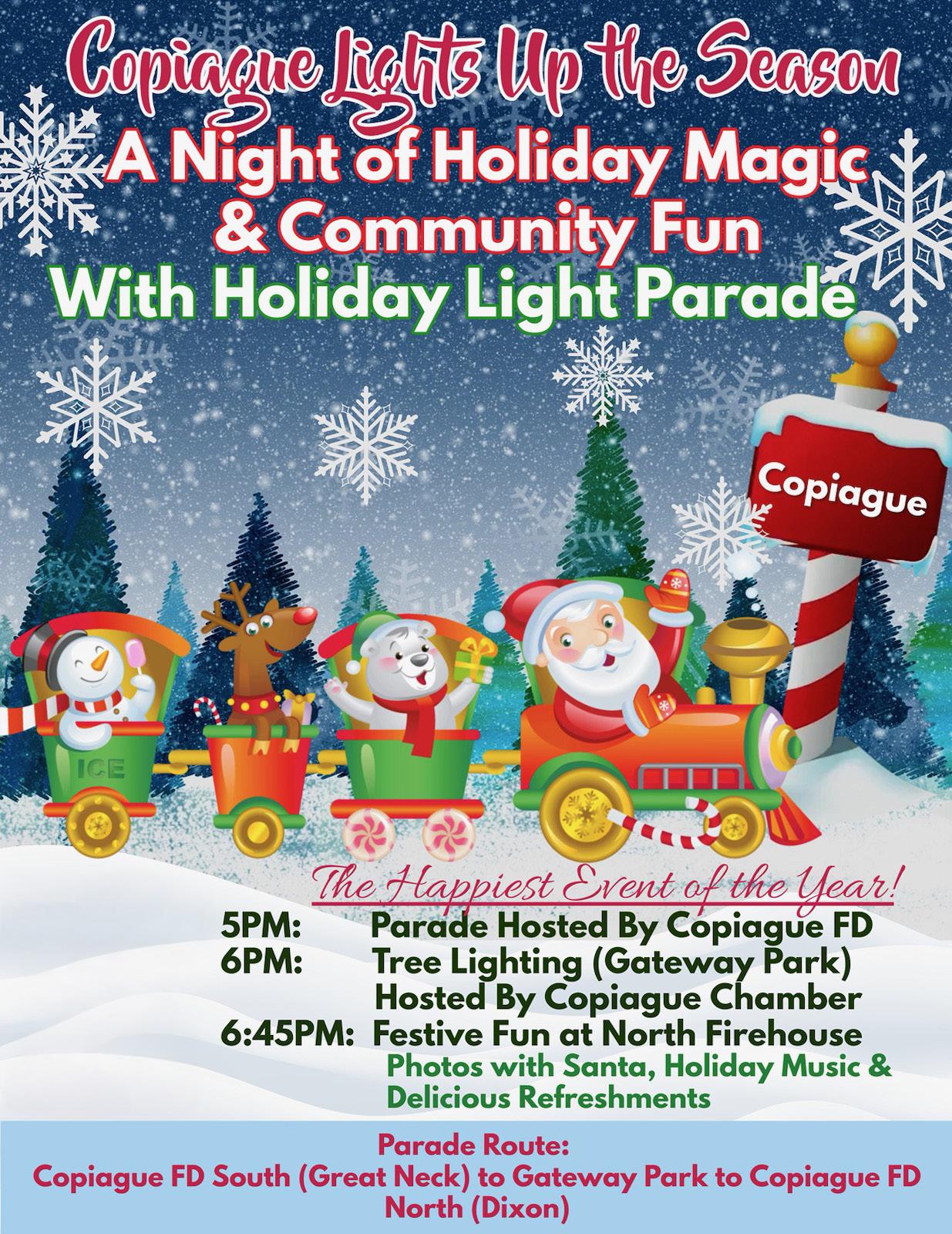 pm, there’s Festive Fun at the North Firehouse, with photos with Santa, holiday music, and refreshments. Parade route: Copiague FD South (Great Neck) to Gateway Park to Copiague FD North.