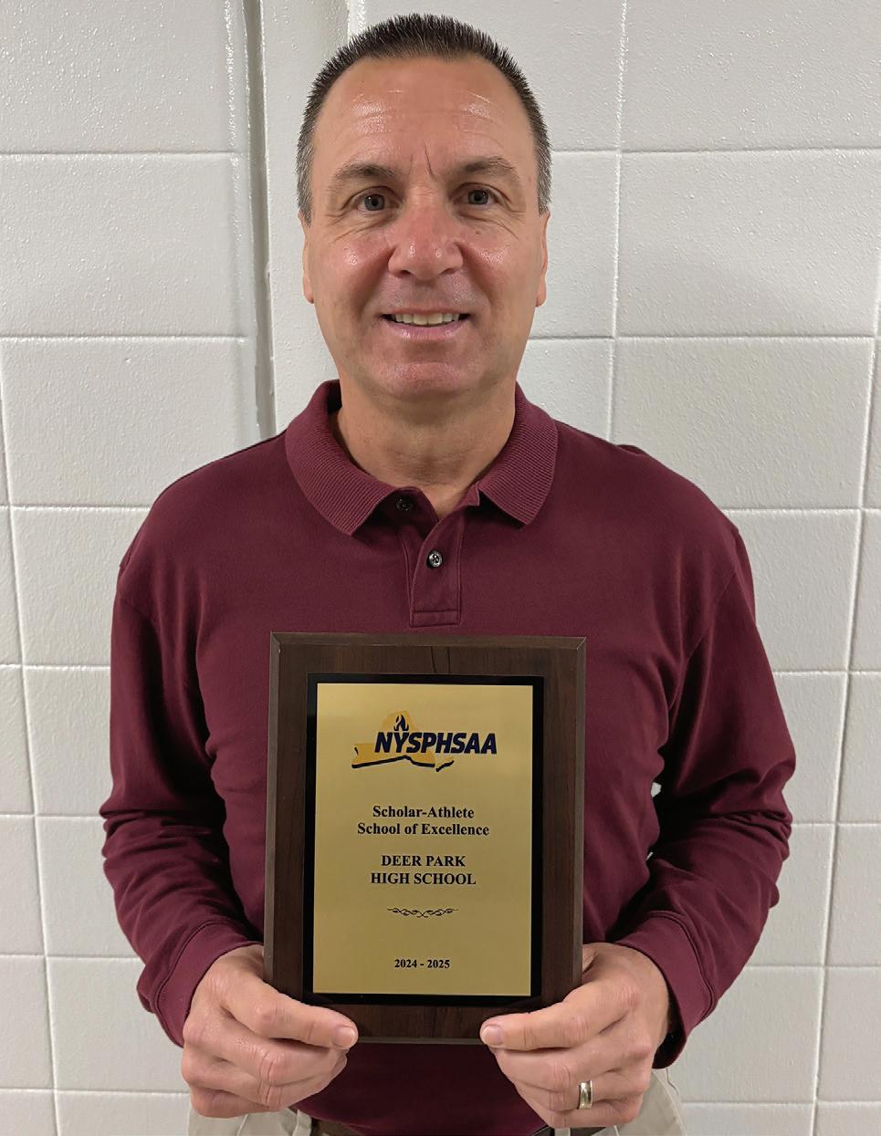 Deer Park High School has been recognized as a 2024-2025 Scholar-Athlete School of Excellence by the New York State Public High School Athletic Association. This prestigious designation required that 75% of the high school’s varsity teams receive the NYSPHSAA’s Scholar-Athlete Team Award for the prior school year. To earn the Scholar-Athlete award, 75% of a team’s players must have a gradepoint average equal to or greater than 90%.