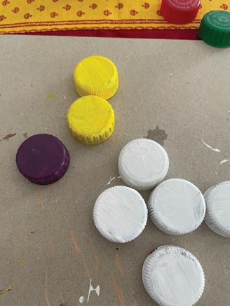 Step 3: Once the paint is dry, paint the sides of the caps with a darker or lighter shade of purple and yellow to resemble the center of a flower (as shown in the picture). Allow it to dry.