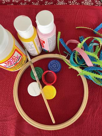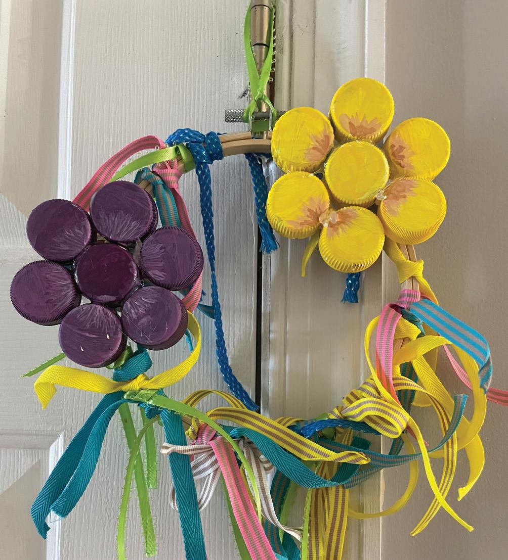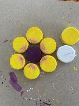 Step 5: Use hot glue to attach 6 yellow bottle caps together to form a flower. Repeat the same process with the purple caps.