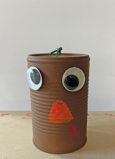 Trace your hand on colored paper or cut feathers from red, orange, and yellow paper. Glue them to the back of the can in a fan shape.