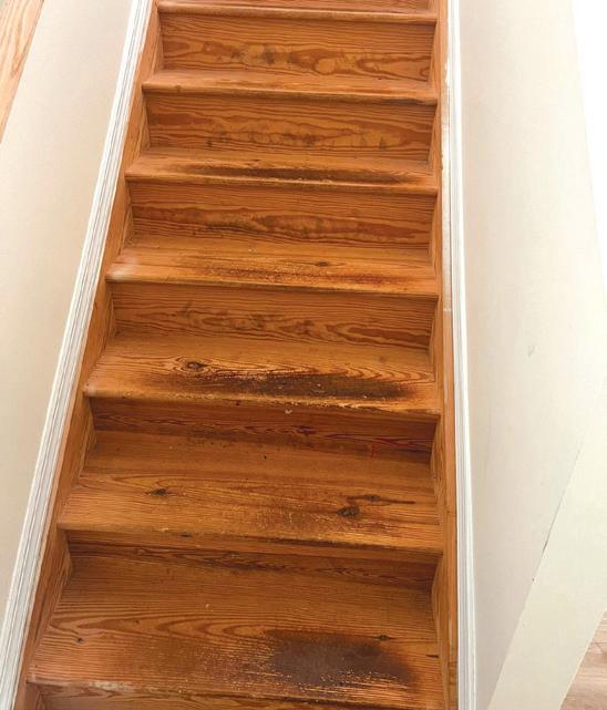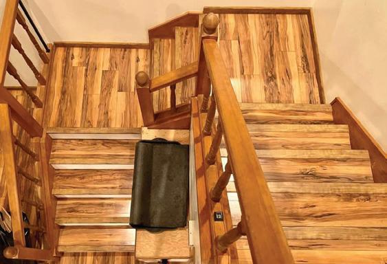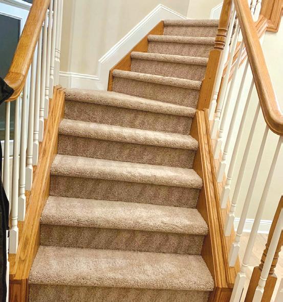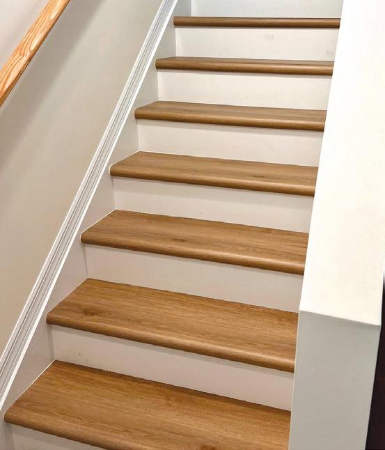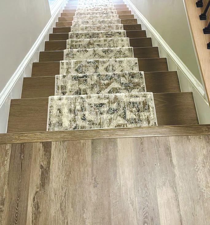 Choose a hard surface stair transformation. Installations expert and Operations Manager at NK Floors, Joe Lewis, skillfully explains the process. “We remove the old carpet, pad, staples, and tack strip. Next, we remove any squeaks and address other concerns about the structural integrity of the stairs. The treads and risers are then carefully cut, beginning from the bottom up, riser then tread. Once that process is complete, the treads and risers are attached with glue and nails and are caulked. Finally, the skirt boards are painted. LVP treads are usually “walk ready” in a few hours, and hardwood treads in four to six hours. I recommend using painted risers for LVP and oak treads for a brighter set of stairs.”