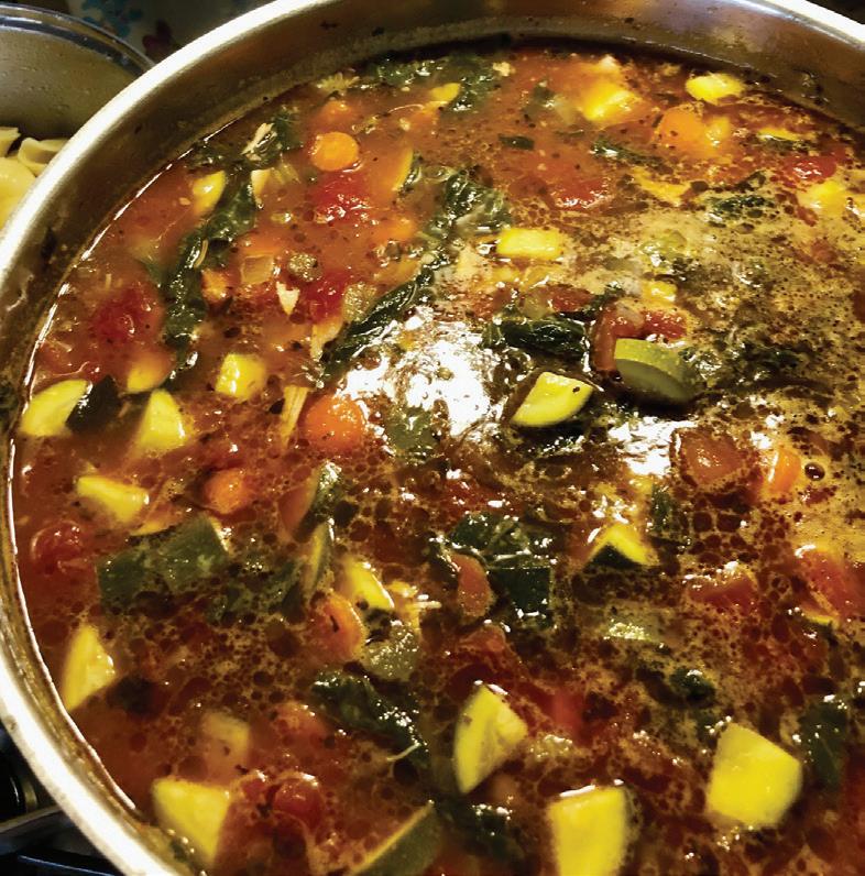6. Bring the pot with the chicken base broth to a gentle boil and add the diced tomatoes, zucchini, and spinach (and butternut squash if following the fall recipe). Cook at a gentle boil or simmer until the vegetables are softened.