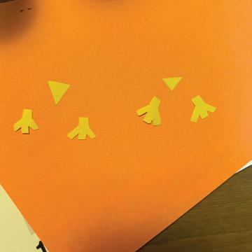 Cut out 5 turkey feathers from the yellow and orange construction paper.