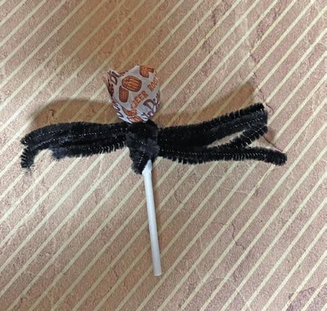 2. Make the legs: Cut each pipe cleaner in half. You should now have 4 equal pieces. Twist them around the lollipop stick, just under the candy, so there are 8 legs (4 on each side).
