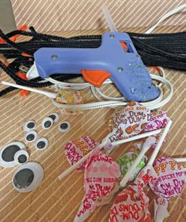 4. Add the eyes: Glue two googly eyes onto the lollipop candy (or onto a small black paper oval you glue first, if you want a bigger head). Let dry.