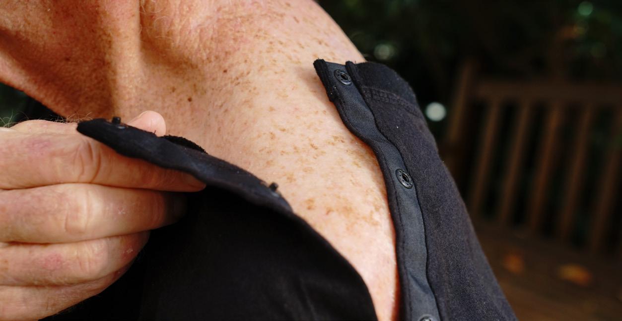 AAFTER observing that some of their own older family members were having trouble putting on a plain t-shirt, the innovative designers at Care & Style came up with a solution: the Flex-A-Tee. It’s a t-shirt style top that features easy to press studs along both shoulder lines.