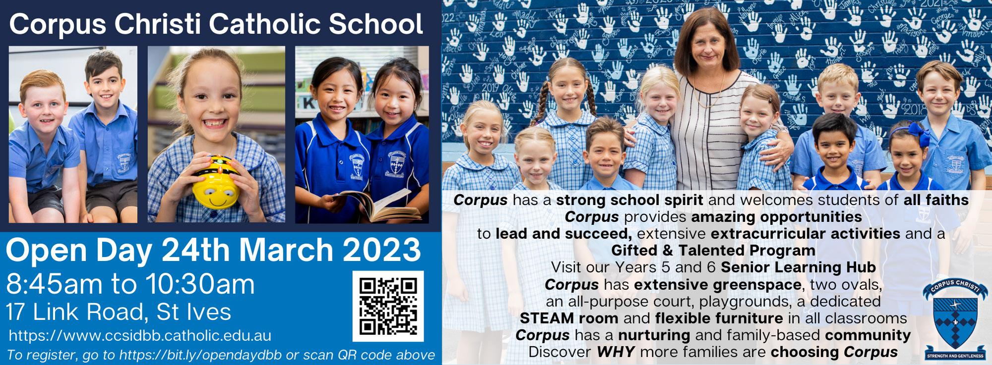 WELCOMING students and families of all backgrounds, cultures and religions. Corpus is a school with a strong spirit, a nurturing and welcoming community, and amazing opportunities to lead and succeed. Corpus Christi hosts open days throughout the year, with the next Open Day scheduled for Friday 24th March 2023 - running from 8:45am to 10:30am. The open day is a structured morning to provide meaningful insight into the school, including a tour of our extensive grounds and classrooms, as well as an opportunity to meet the Principal, teachers, learning specialists, students and other families. Big enough to matter, yet small enough to care, Corpus is the perfect choice for your child.