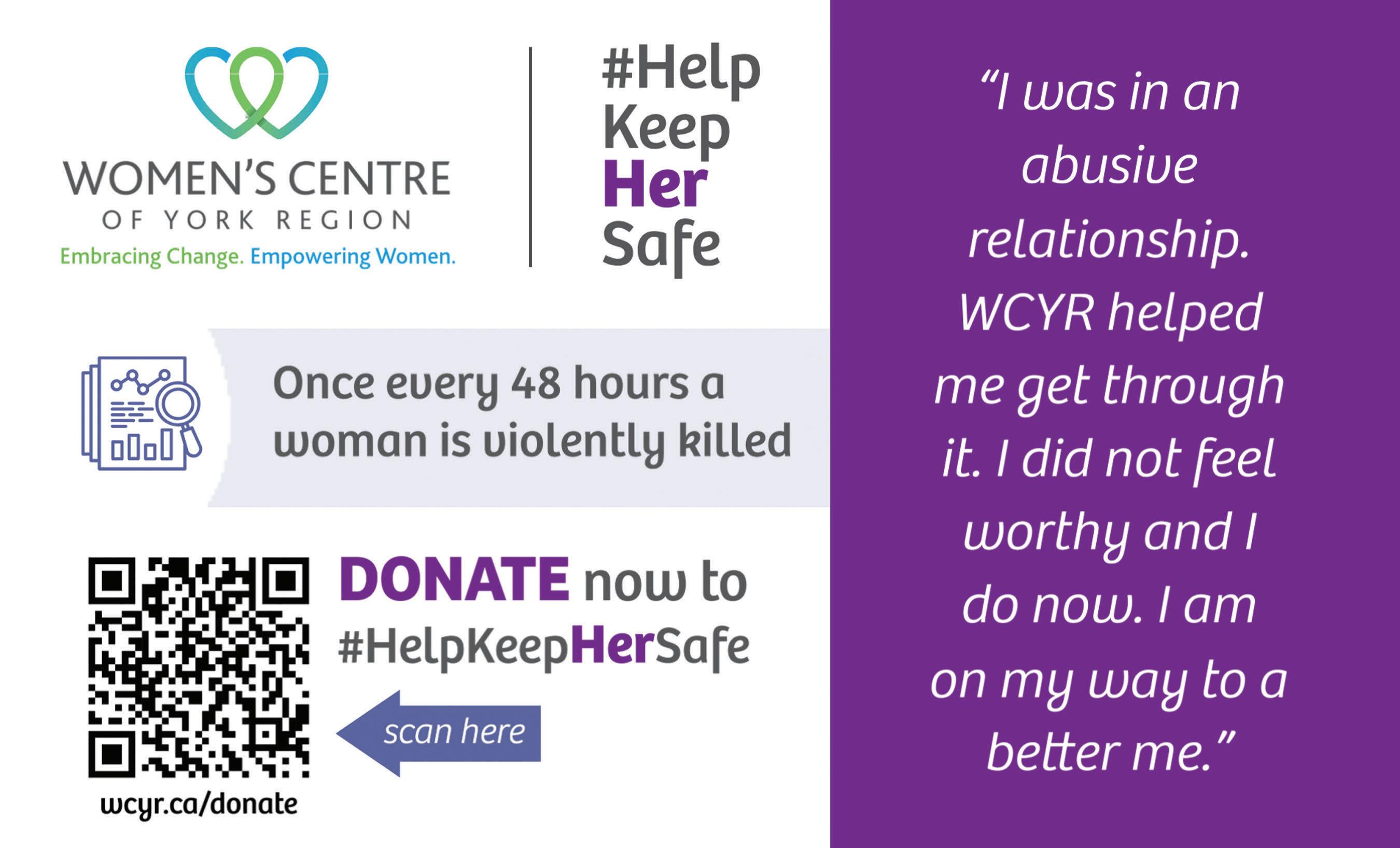 Your donation remains critical to meet the ongoing needs of women in York Region experiencing violence, abuse, or living in poverty. We recognize that the meaning of ‘safe’ and ‘help’ are not the same for every woman and that every woman has different needs to keep themselves and their families safe. WCYR supports women and their families with employment, mental health, housing, and the necessities of life.