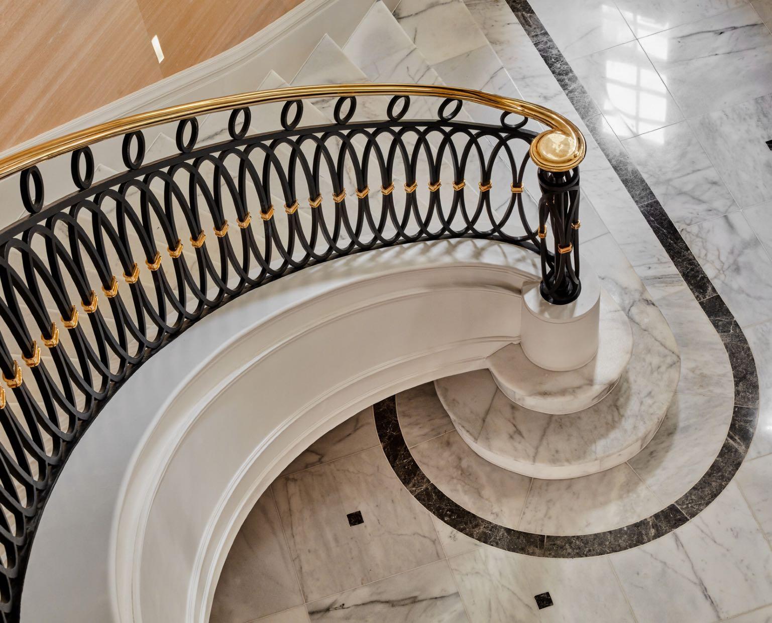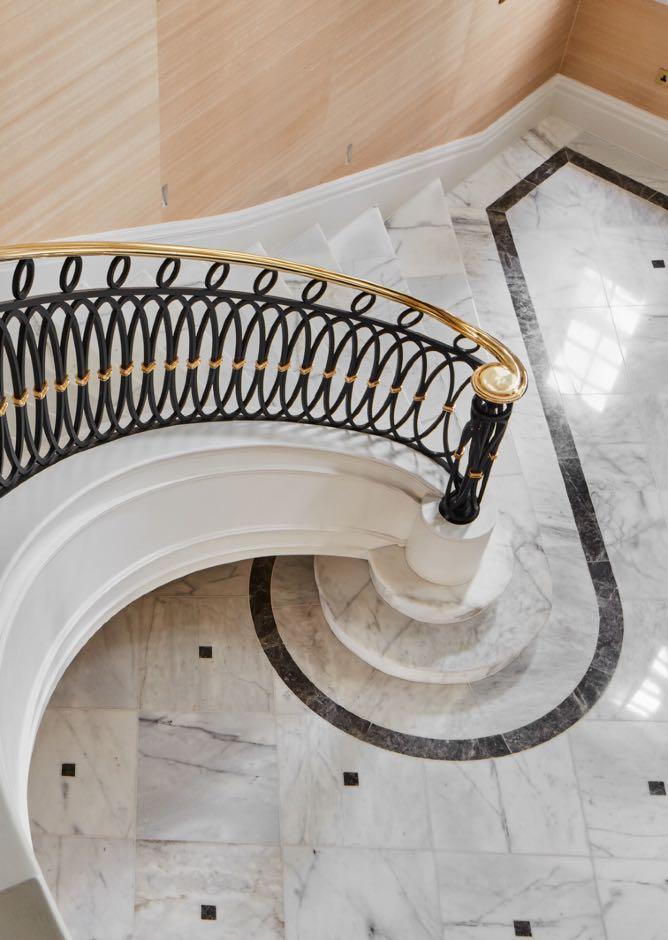 From the first floor landing the full impact of the double height entrance hall can be felt. The floor of the Grand Entrance Hall sees the marble laid in a diamond patten with a central grey marble inlay and boarder. The boarder is particularly beautiful where it sweeps around the double bullnose step at the commencement of the main staircase. The bespoke balustrade of interconnecting ellipses is topped with a polished extruded brass handrail, that finishes with a solid polished brass volute, as can be seen in the photograph to the left.