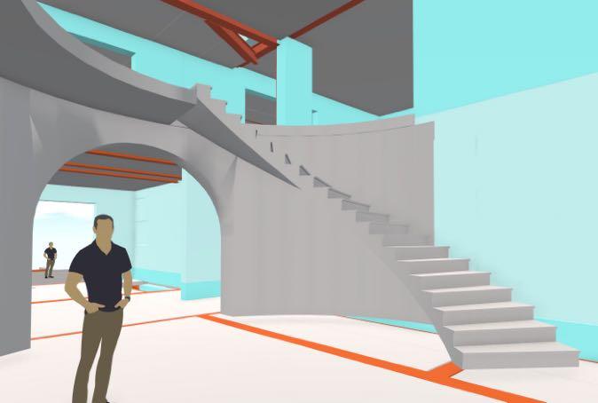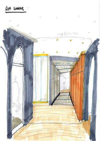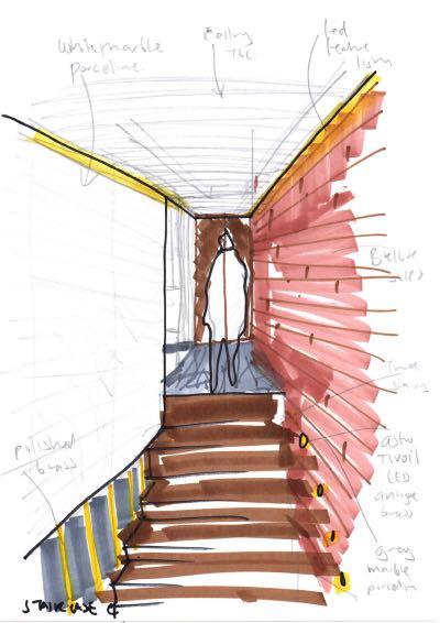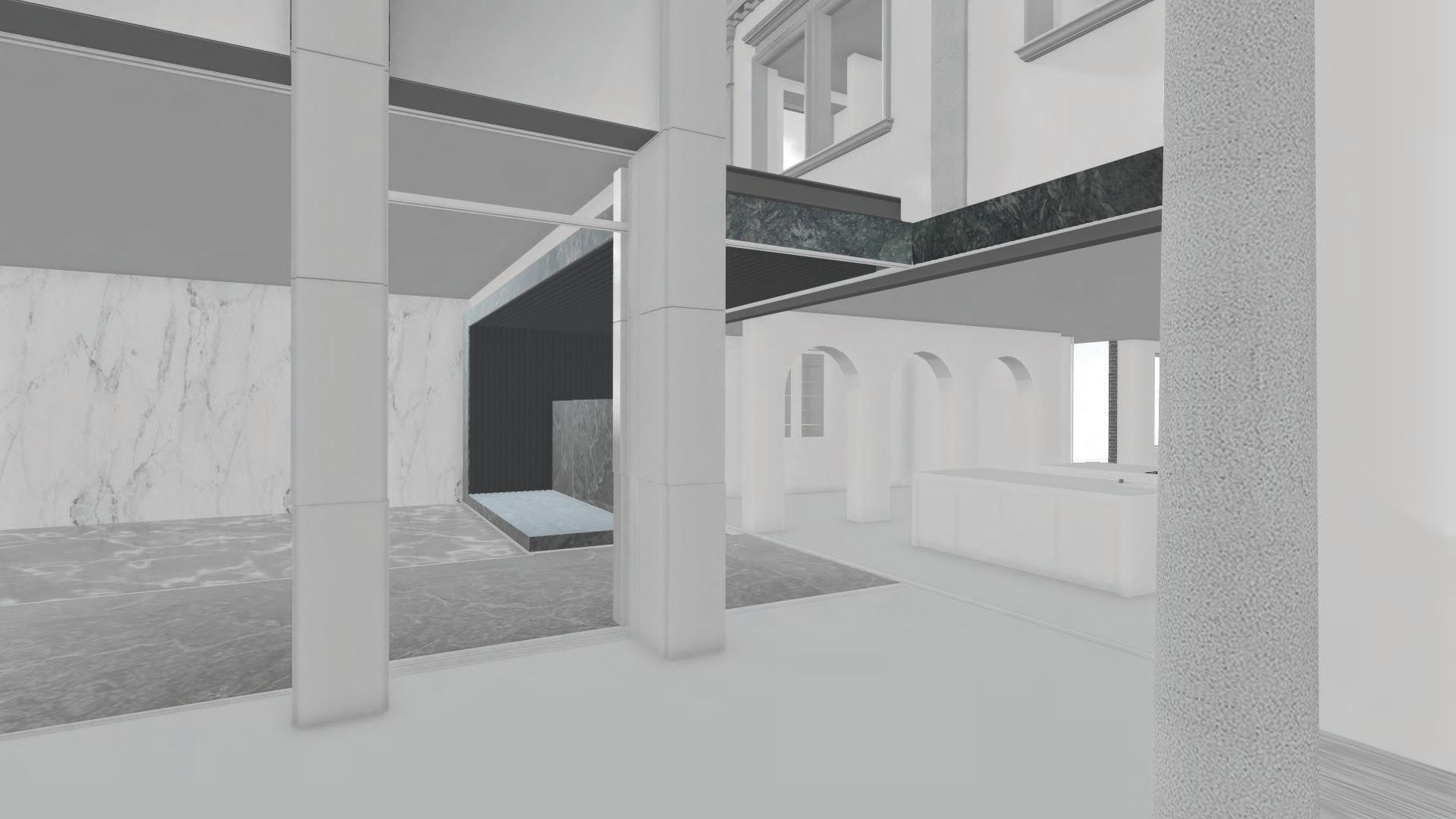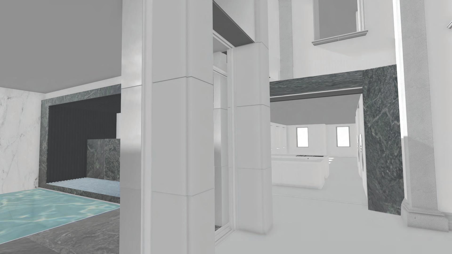 Above: Early CGI to consider: Marble flooring, Balustrade design and double height wall panelling backdrop with slot to the spaces beyond.
