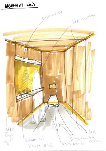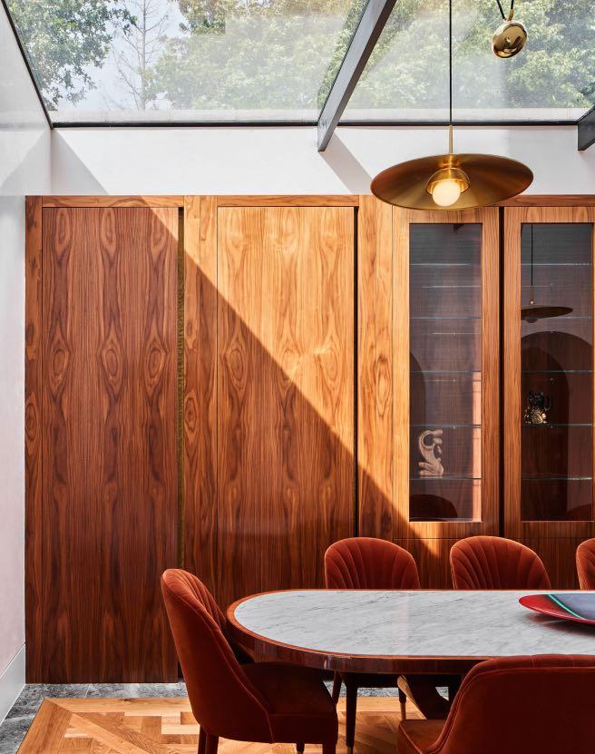 One of the original concepts of the 2016 approved scheme was to a have double height entertainment space with a glazed roof overhead. The change of layout, resulting from the introduction of the central sweeping staircase, meant there was insufficient area to have this space in the revised design. Therefore, it was agreed that the ground floor entertainment space, together with the separate Family Room, would be sacrificed to facilitate the new staircase location. However, the glass roof, as a design feature and experience of the residence, remained and was incorporated into the Informal Dining Room. Polished brass pendant lights (the same as those in the Kitchen) hang from the glass roof support beams, so that the beams have a purpose beyond structural support. The lights hang over an eight-seater marble topped table, located on a Versailles timber panelled floor with polished plaster finished surrounding walls. Against the northern wall sits a piece of bespoke American Walnut joinery. The cabinet runs from wall to wall and is symmetrical around the central display cabinet. The photographs below show how one of the weaknesses of the 2016 scheme was addressed, with the end unit opening to reveal a free-standing wash hand basin with ceiling mounted tab and WC in a separate enclosure to the side, as shown in the photograph to the right.
