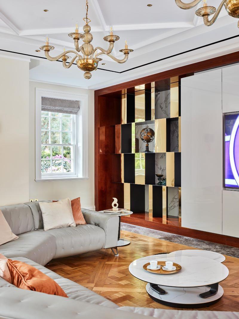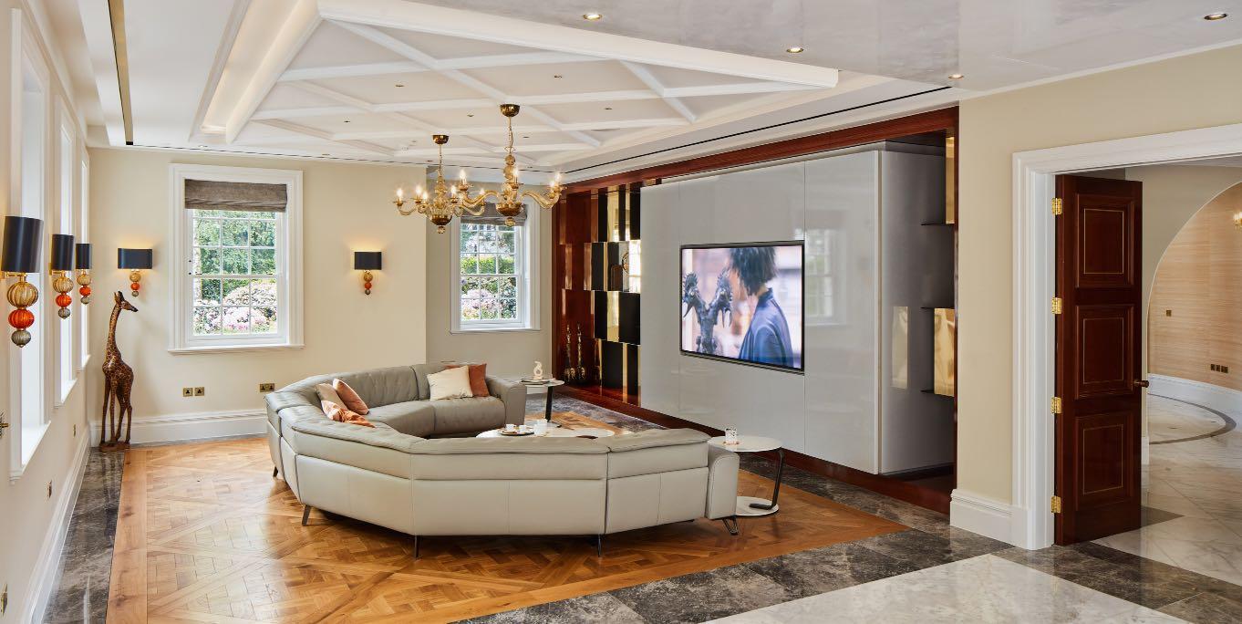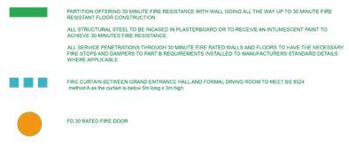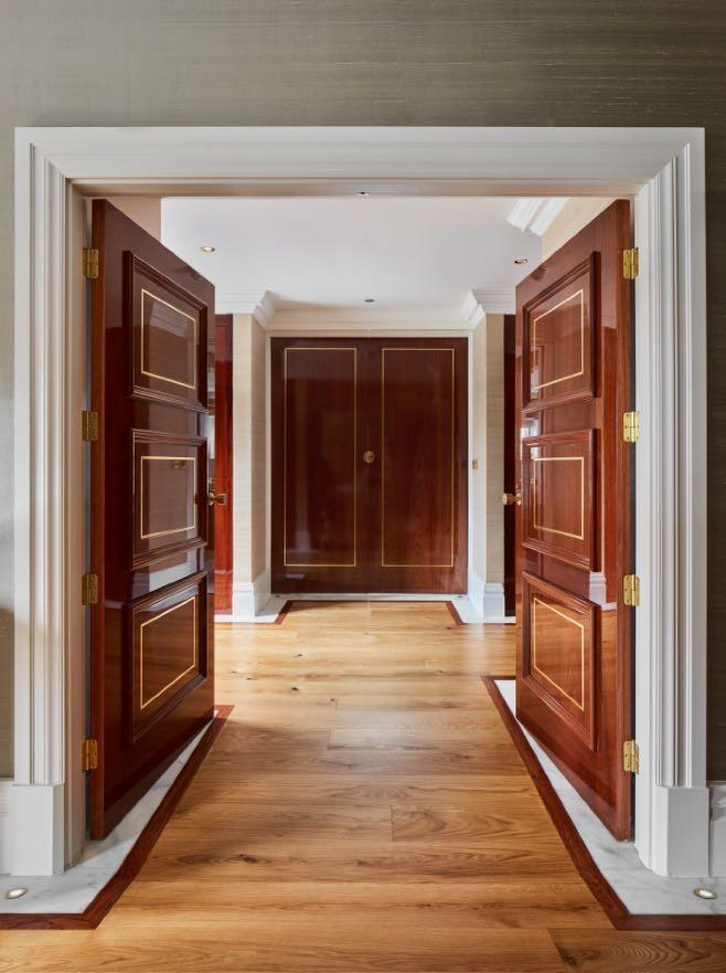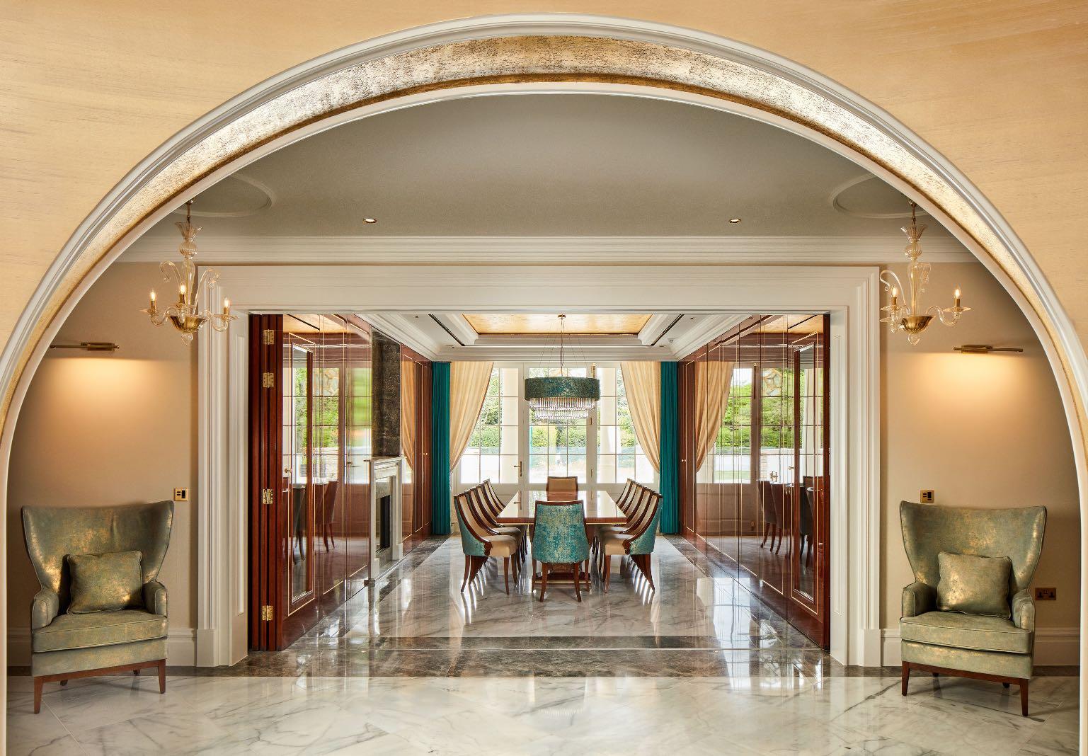 All doors which lead onto the main staircase are a minimum half-hour fire rated, but to meet part B of the English Building Control regulations, a half-hour fire shutter was installed between the Grand Entrance Hall and the Formal Dining Room and another in the basement, to allow two escape routes to be created from the Cinema Room. Both are fully integrated into their respective space‘s design. The shutter that serves the Formal Dining Room is concealed