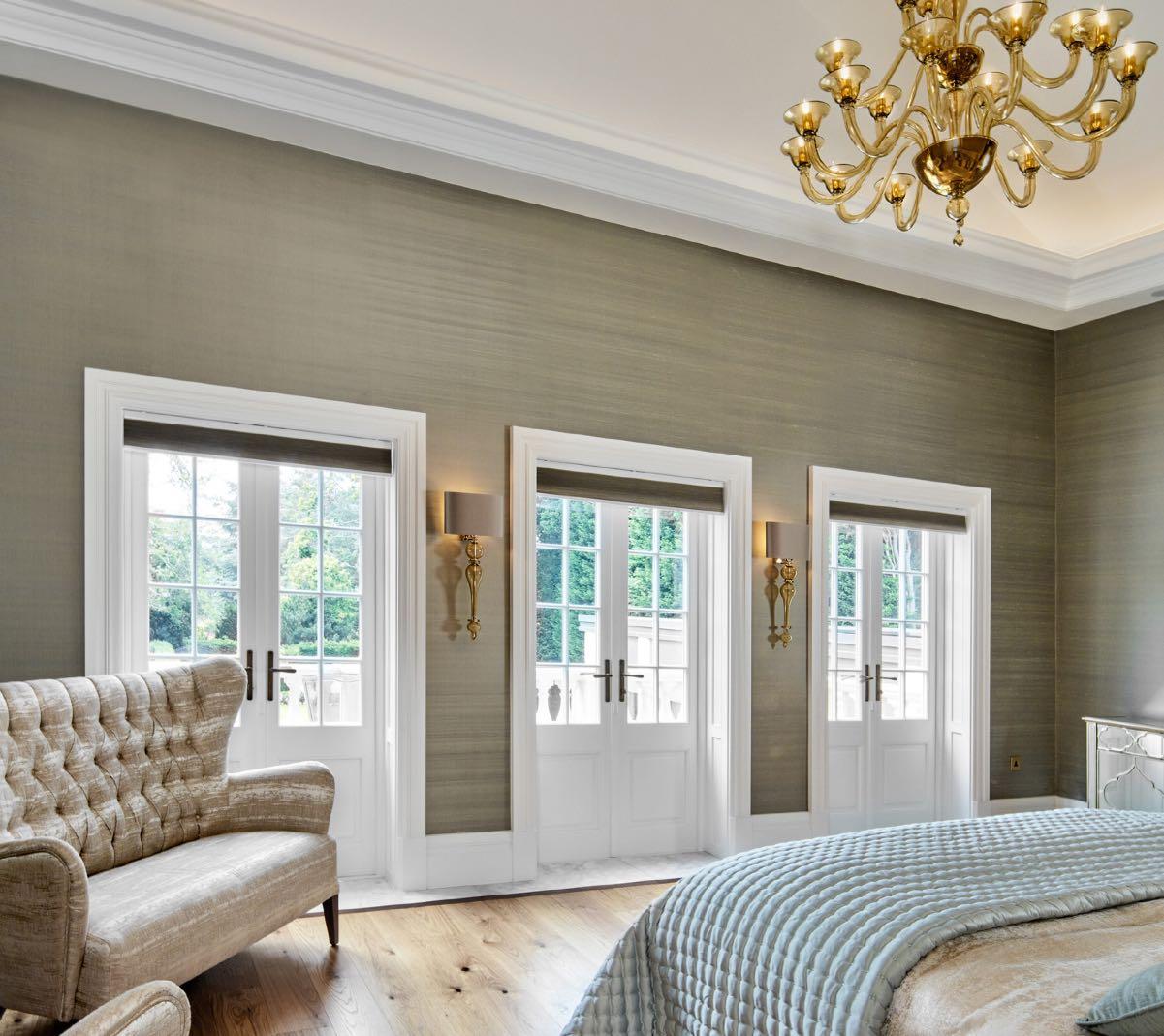 The Master Bedroom Suite is located centrally in the house so that it can benefit from the balcony over the Formal Dining Room portico and the view down the Formal Landscaped Gardens. Accessed via double doors from the first-floor landing, rather than entering into a vast space one enters a bijou lobby where a large painting is displayed. Behind the wall an oak staircase, shown in the below photograph, provides private access up to the roof garden that houses a large hot tub. The master bedroom itself is vaulted with a perimeter feature cornice bulkhead, with warm LED up lighting. Adding drama to the space, an elegant Murano chandelier is located centrally in the vaulted space and is complemented by matching wall lights. It was decided to continue the colour palette of gold and sage green into the master bedroom from the landing, with subtle highlights via textile tones and natures.