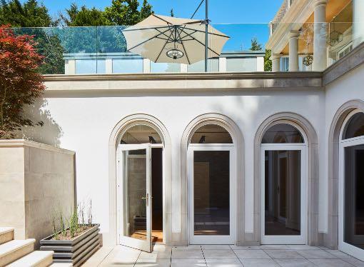 To achieve the desired aesthetic, all the windows are of a sliding sash design. They are all of factory painted hardwood, with double glazed units and draft / acoustic seals to ensure the highest possible air tightness and environmental performance, while remaining as easy to use and visually pleasing as possible. All the windows have cast stone surrounds with feature windows, with greater window head detail.