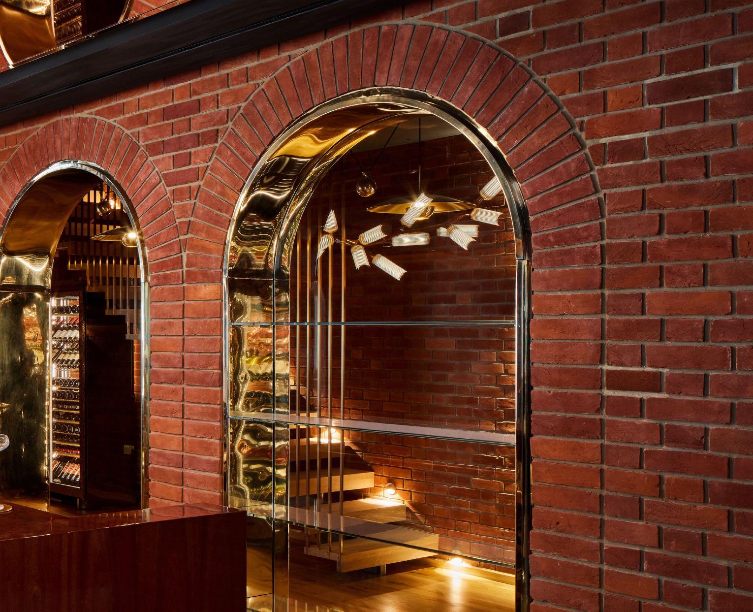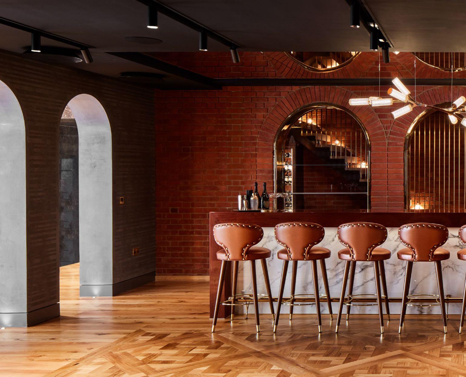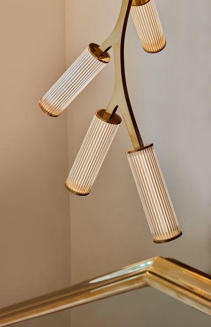 The ceiling of the Kitchen is finished in ivory polished plaster into which a brass effect extract fan is integrated, and centrally a pair of stylish and extremely functional, polished brass pendant lights hang. Although of a contemporary design, the light‘s roots are in Bauhaus. The same lights as the single pendants are used in the nearby Informal Dining Room and in the Basement Wine Cellar.